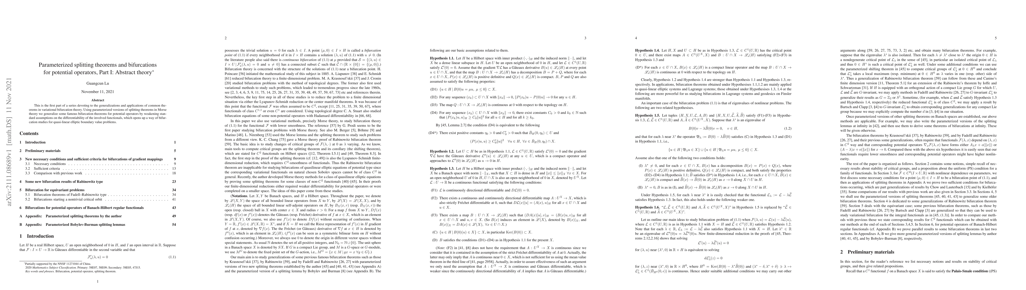 This paper generalizes famous bifurcation theorems for potential operators by relaxing differentiability assumptions, enabling studies of quasi-linear elliptic boundary value problems. It introduces parameterized splitting theorems in Morse theory to analyze bifurcations with weakened standard conditions.
