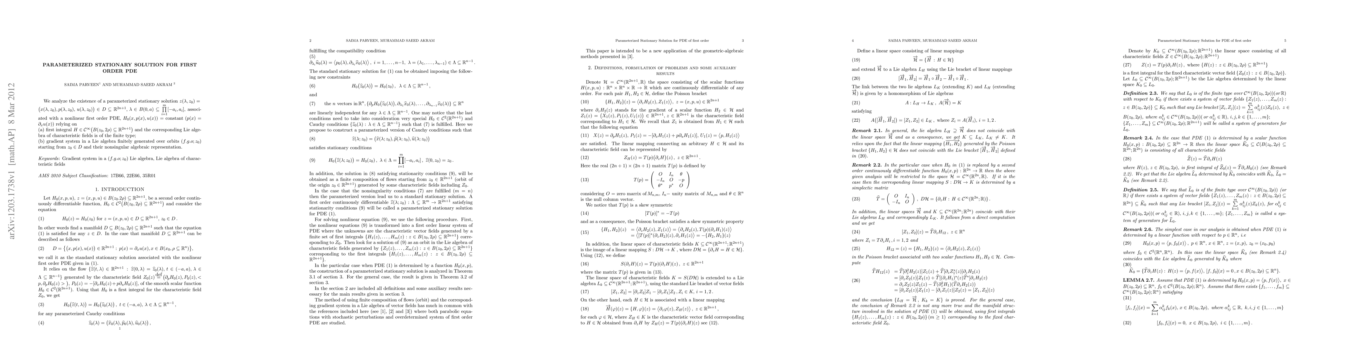 We analyze the existence of a parameterized stationary solution $z(\lambda,z_0)=\big(x(\lambda,z_0), p(\lambda,z_0),\,u(\lambda,z_0)\big)\in D\subseteq\mathbb{R}^{2n+1},\,\lambda\in B(0,a)\subseteq\mathop{\prod}\limits_{i=1}^{m}[-a_i,a_i]$, associated with a nonlinear first order PDE, $H_0(x,p(x),u(x))=\hbox{constant}\,\,(p(x)=\partial_x u(x))$ relying on (a) first integral $H\in\mathcal{C}^\infty\big(B(z_0,2\rho)\subseteq\mathbb{R}^{2n+1}\big)$ and the corresponding Lie algebra of characteristic fields is of the finite type; (b) gradient system in a Lie algebra finitely generated over orbits $(f.g.o;z_0)$ starting from $z_0\in D$ and their nonsingular algebraic representation.