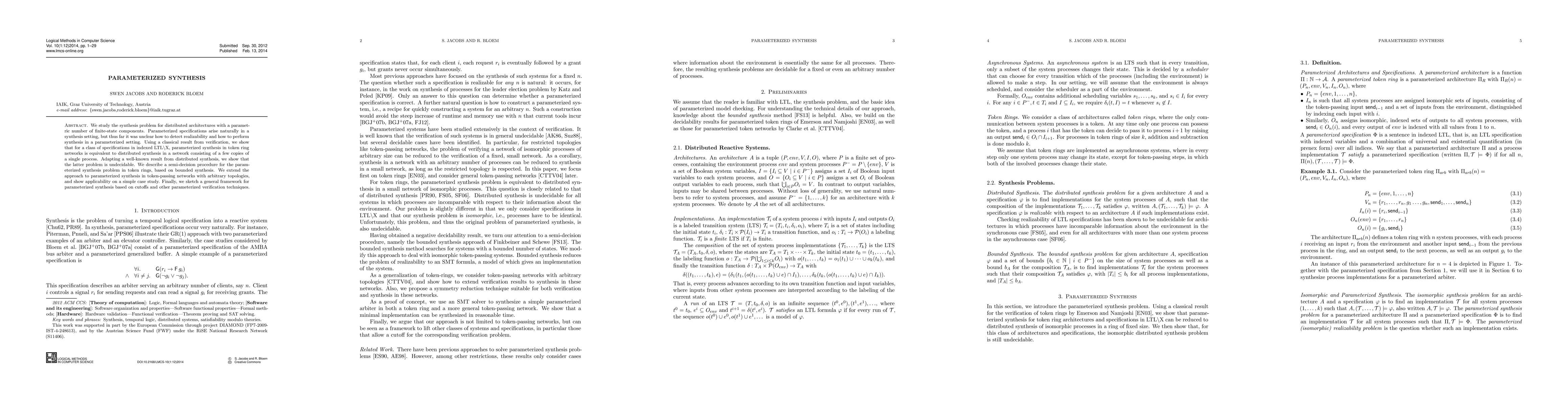 This paper investigates the synthesis problem for distributed architectures with a parametric number of finite-state components. It establishes the equivalence of parameterized synthesis in token ring networks to distributed synthesis in a network of a few copies of a single process, proving the latter problem to be undecidable. The authors propose a semi-decision procedure for parameterized synthesis based on bounded synthesis and extend the approach to token-passing networks.