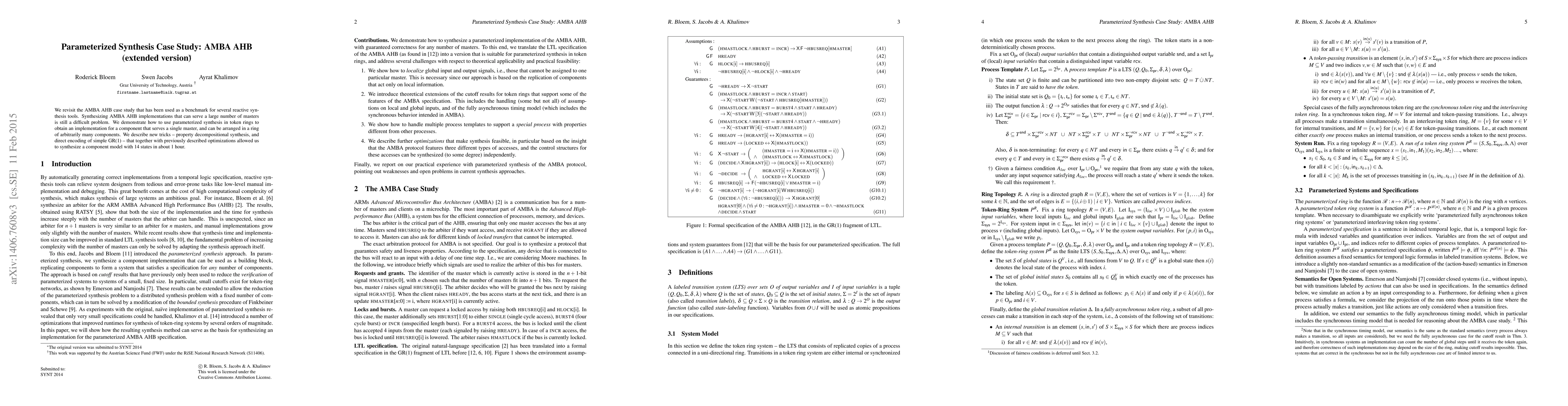 This paper revisits the AMBA AHB benchmark, demonstrating parameterized synthesis techniques for creating scalable implementations that can serve multiple masters. The authors introduce new synthesis methods, achieving a 14-state model in 30 minutes, highlighting advancements in reactive synthesis tools.