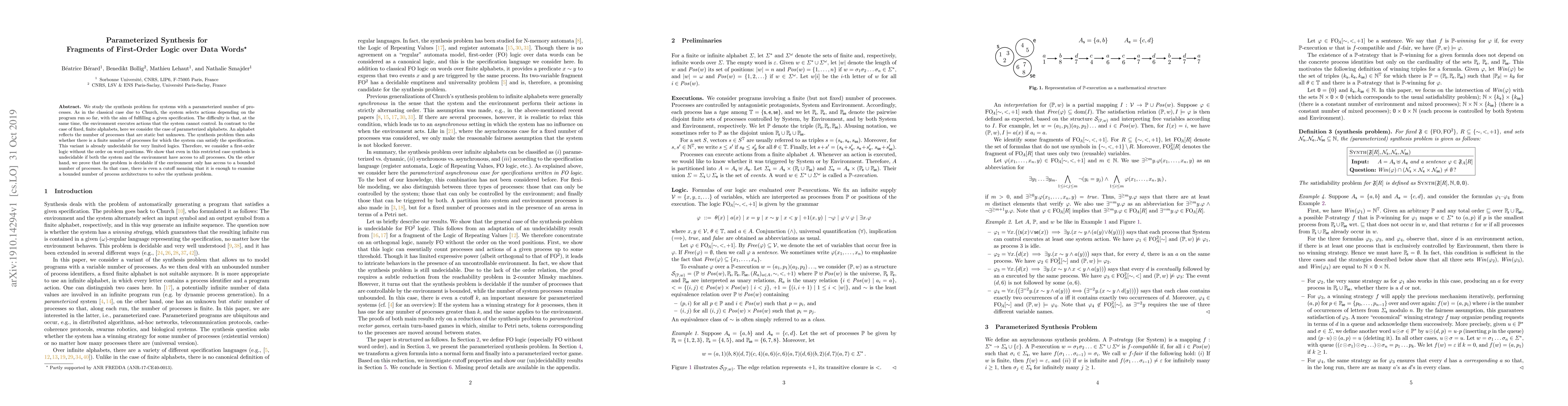 The research employs a formal methods approach, specifically synthesis for systems with a parameterized number of processes, utilizing first-order logic without order on word positions.
