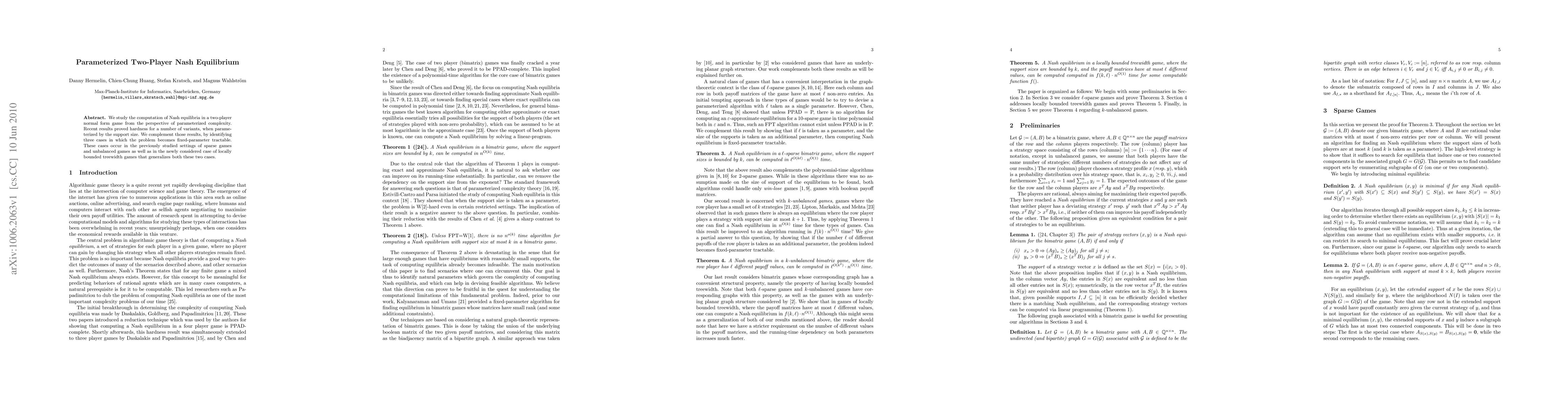This paper investigates the parameterized complexity of computing Nash equilibria in two-player normal form games, identifying fixed-parameter tractability in sparse, unbalanced, and locally bounded treewidth games. It complements previous hardness results by pinpointing three specific cases where the problem becomes tractable.