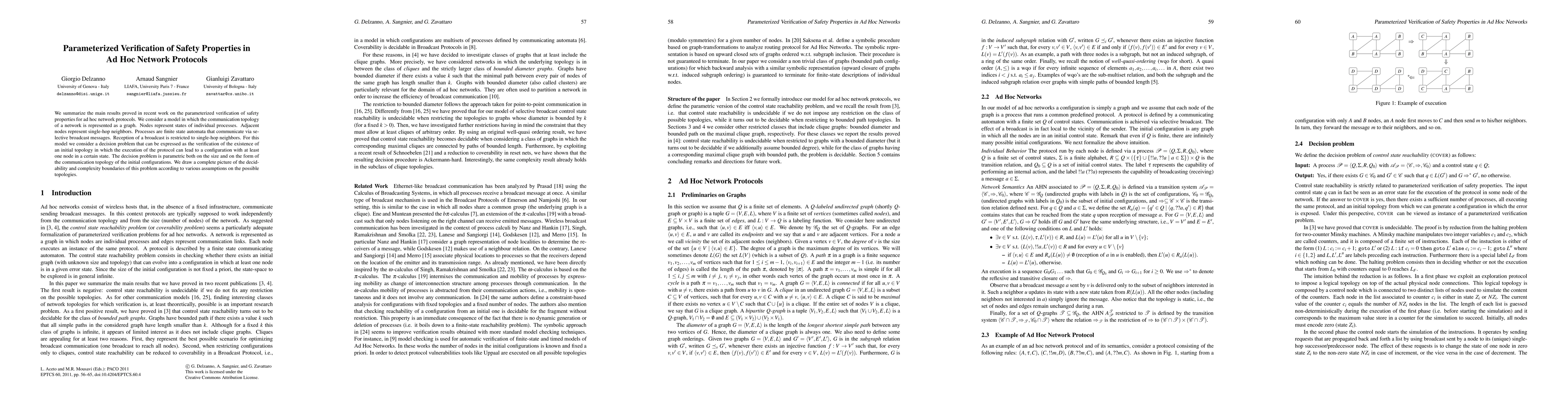 Researchers developed a method to verify safety properties in ad hoc network protocols using graph theory and finite state automata. They created a decision problem that considers the existence of an initial topology leading to a desired configuration, with boundaries on decidability and complexity.