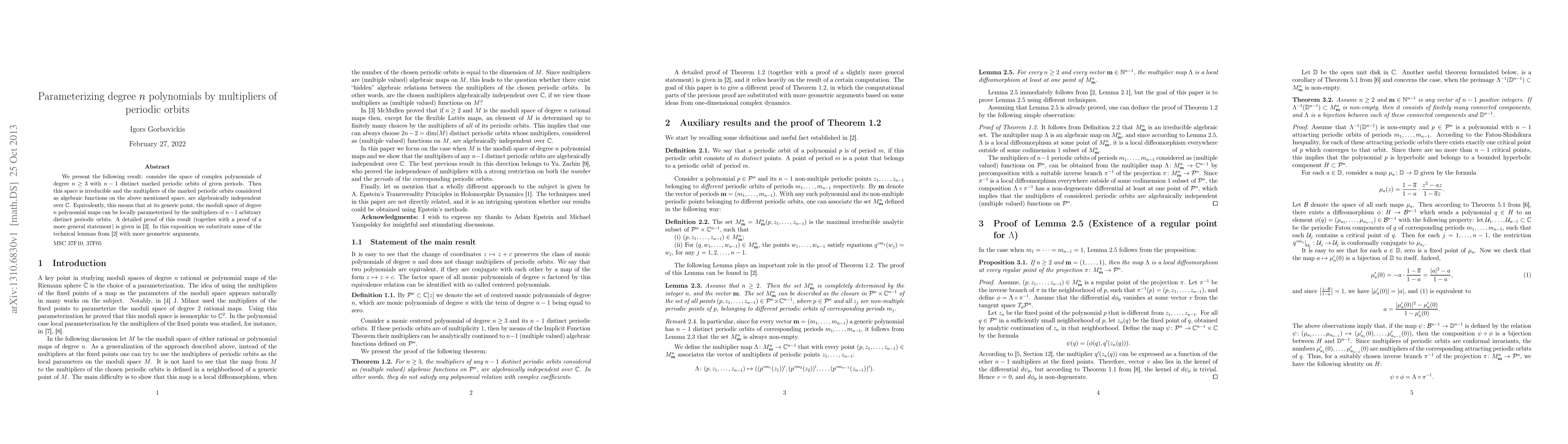 We present the following result: consider the space of complex polynomials of degree n>2 with n-1 distinct marked periodic orbits of given periods. Then this space is irreducible and the multipliers of the marked periodic orbits considered as algebraic functions on the above mentioned space, are algebraically independent over $\mathbb C$. Equivalently, this means that at its generic point, the moduli space of degree n polynomial maps can be locally parameterized by the multipliers of n-1 arbitrary distinct periodic orbits. A detailed proof of this result (together with a proof of a more general statement) is given in [arXiv:1305.0867]. In this exposition we substitute some of the technical lemmas from [arXiv:1305.0867] with more geometric arguments.