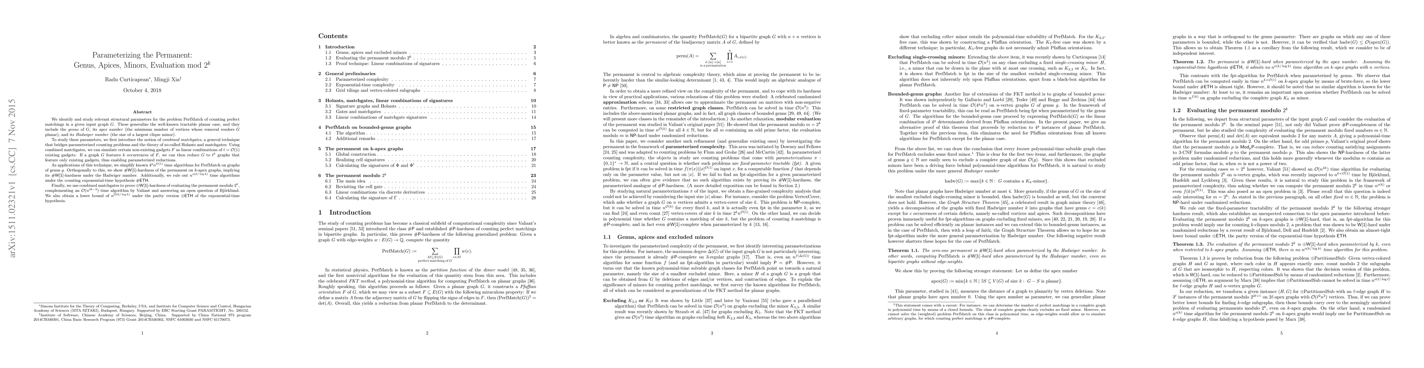 This paper introduces structural parameters to analyze the complexity of counting perfect matchings in graphs, including genus, apex number, and Hadwiger number. It employs combined matchgates to simplify existing algorithms and prove new hardness results, showing #W[1]-hardness for the permanent on k-apex graphs and establishing lower bounds for evaluating the permanent modulo 2^k.