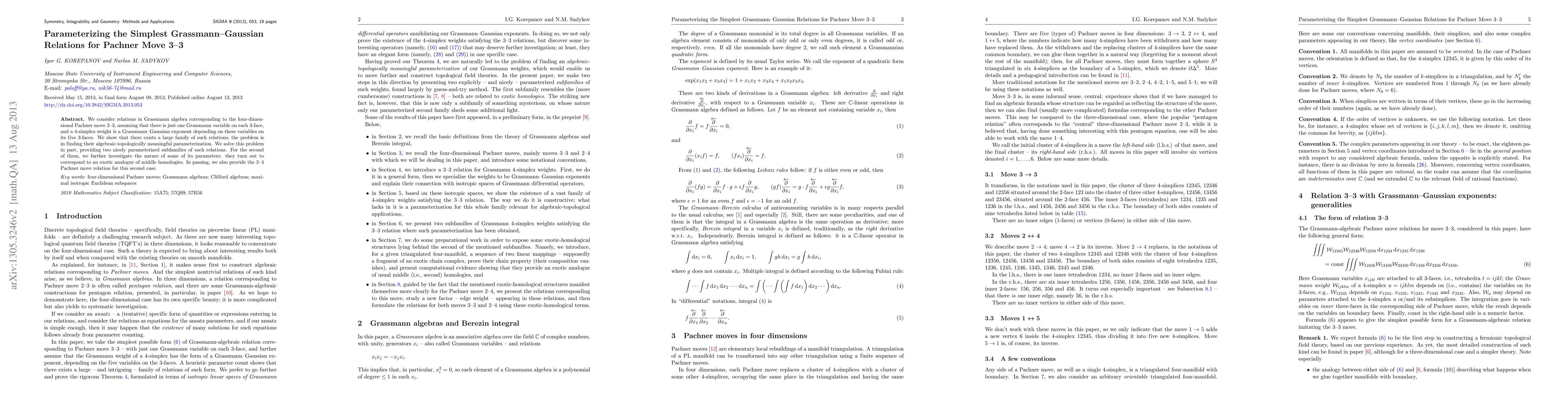 This paper explores algebraic relations in Grassmann algebra related to the four-dimensional Pachner move 3-3, parameterizing them to reveal meaningful topological insights. It identifies two parameterized subfamilies, with particular focus on the second subfamily's parameters linked to an exotic middle homology analogue.