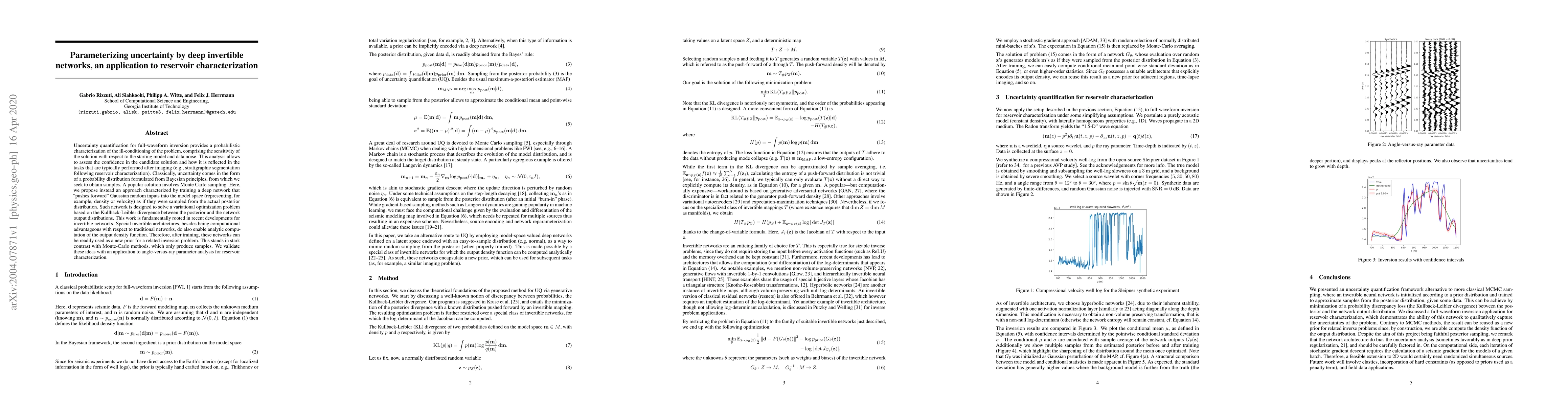 Uncertainty quantification for full-waveform inversion provides a probabilistic characterization of the ill-conditioning of the problem, comprising the sensitivity of the solution with respect to the starting model and data noise. This analysis allows to assess the confidence in the candidate solution and how it is reflected in the tasks that are typically performed after imaging (e.g., stratigraphic segmentation following reservoir characterization). Classically, uncertainty comes in the form of a probability distribution formulated from Bayesian principles, from which we seek to obtain samples. A popular solution involves Monte Carlo sampling. Here, we propose instead an approach characterized by training a deep network that "pushes forward" Gaussian random inputs into the model space (representing, for example, density or velocity) as if they were sampled from the actual posterior distribution. Such network is designed to solve a variational optimization problem based on the Kullback-Leibler divergence between the posterior and the network output distributions. This work is fundamentally rooted in recent developments for invertible networks. Special invertible architectures, besides being computational advantageous with respect to traditional networks, do also enable analytic computation of the output density function. Therefore, after training, these networks can be readily used as a new prior for a related inversion problem. This stands in stark contrast with Monte-Carlo methods, which only produce samples. We validate these ideas with an application to angle-versus-ray parameter analysis for reservoir characterization.