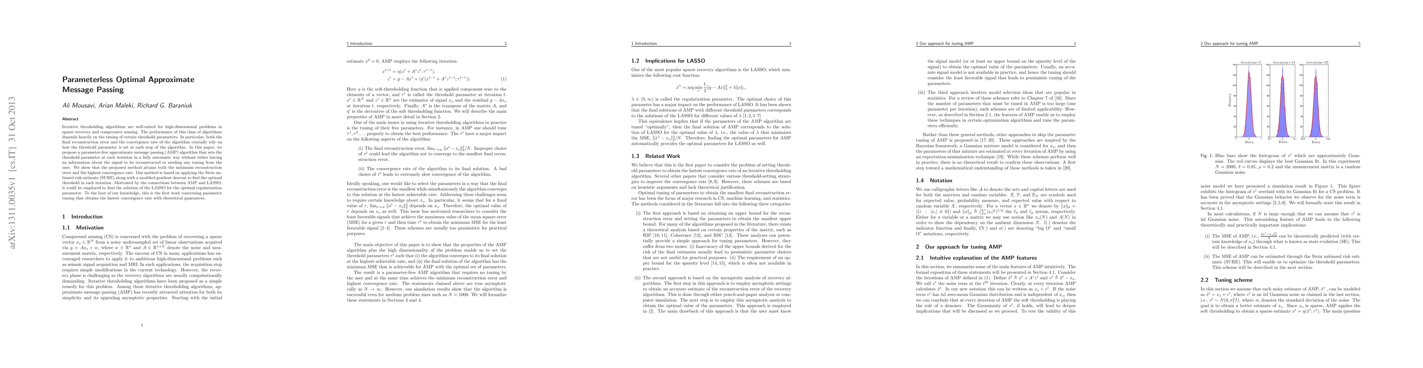 Iterative thresholding algorithms are well-suited for high-dimensional problems in sparse recovery and compressive sensing. The performance of this class of algorithms depends heavily on the tuning of certain threshold parameters. In particular, both the final reconstruction error and the convergence rate of the algorithm crucially rely on how the threshold parameter is set at each step of the algorithm. In this paper, we propose a parameter-free approximate message passing (AMP) algorithm that sets the threshold parameter at each iteration in a fully automatic way without either having an information about the signal to be reconstructed or needing any tuning from the user. We show that the proposed method attains both the minimum reconstruction error and the highest convergence rate. Our method is based on applying the Stein unbiased risk estimate (SURE) along with a modified gradient descent to find the optimal threshold in each iteration. Motivated by the connections between AMP and LASSO, it could be employed to find the solution of the LASSO for the optimal regularization parameter. To the best of our knowledge, this is the first work concerning parameter tuning that obtains the fastest convergence rate with theoretical guarantees.