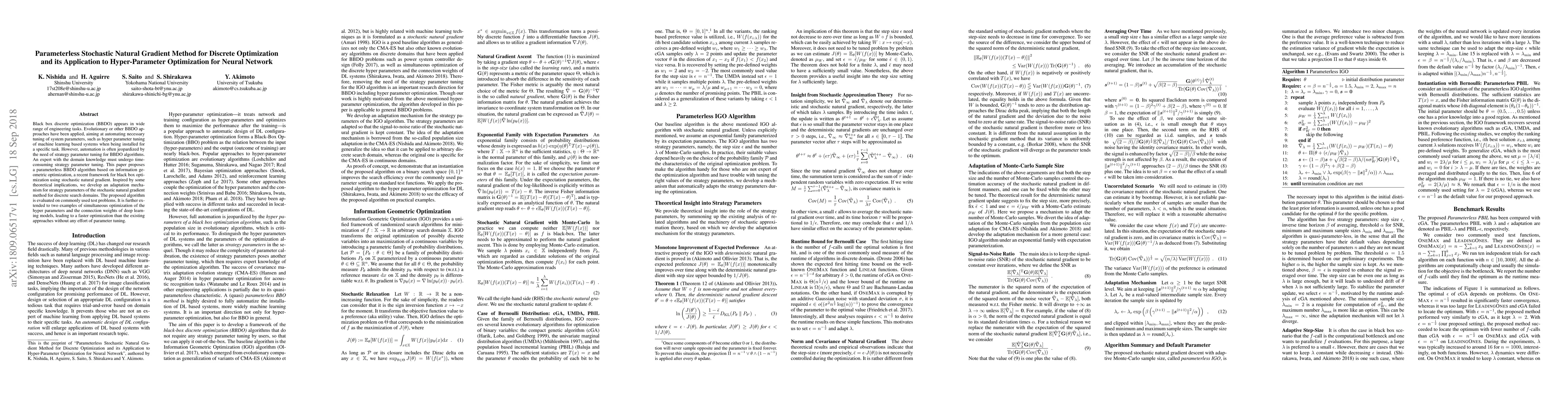 This paper introduces a parameterless stochastic natural gradient method for black box discrete optimization, which automates the tuning of system parameters, particularly for hyper-parameter optimization in neural networks. The proposed method eliminates the need for manual tuning of strategy parameters, leading to faster optimization compared to existing approaches.