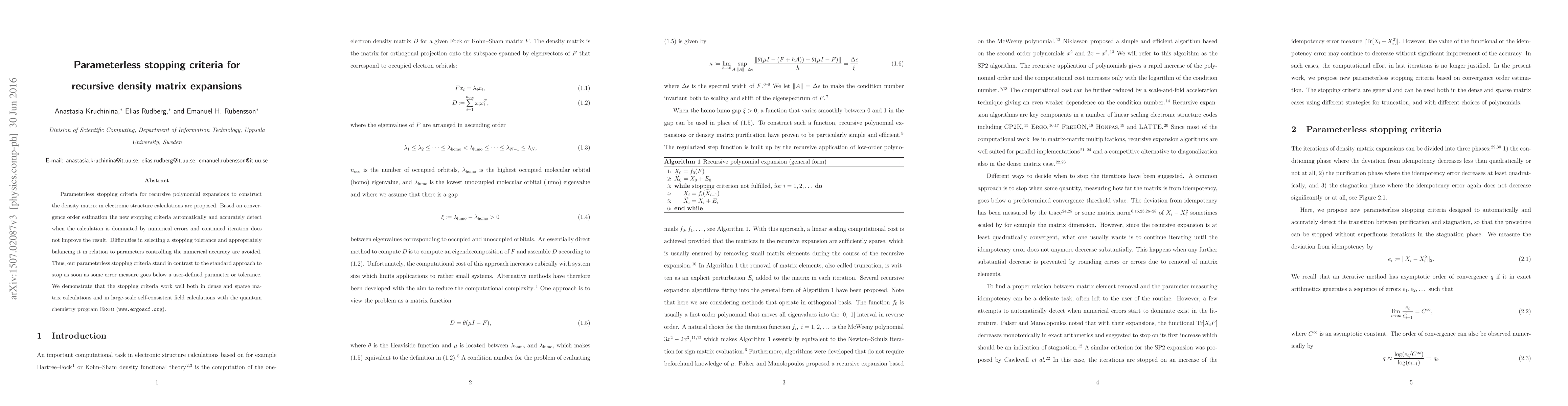 Parameterless stopping criteria for recursive polynomial expansions to construct the density matrix in electronic structure calculations are proposed. Based on convergence order estimation the new stopping criteria automatically and accurately detect when the calculation is dominated by numerical errors and continued iteration does not improve the result. Difficulties in selecting a stopping tolerance and appropriately balancing it in relation to parameters controlling the numerical accuracy are avoided. Thus, our parameterless stopping criteria stands in contrast to the standard approach to stop as soon as some error measure goes below a user-defined parameter or tolerance. We demonstrate that the stopping criteria work well both in dense and sparse matrix calculations and in large-scale self-consistent field calculations with the quantum chemistry program Ergo (www.ergoscf.org).
