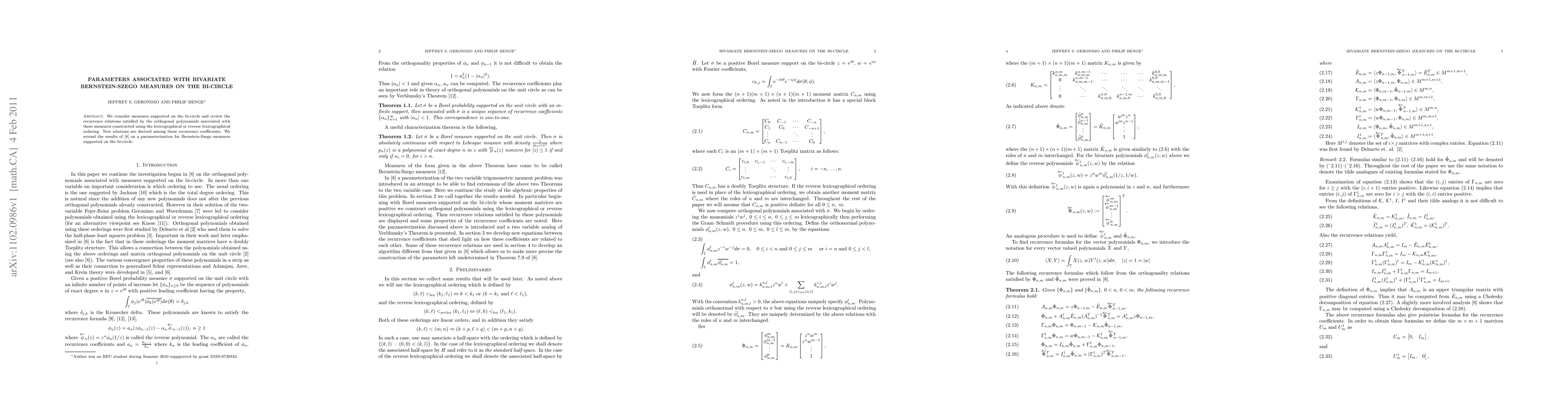 Summary: This paper explores recurrence relations for orthogonal polynomials tied to measures on the bi-circle, deriving new relations among the coefficients. It extends previous parameterizations of Bernstein-Szego measures on the bi-circle.