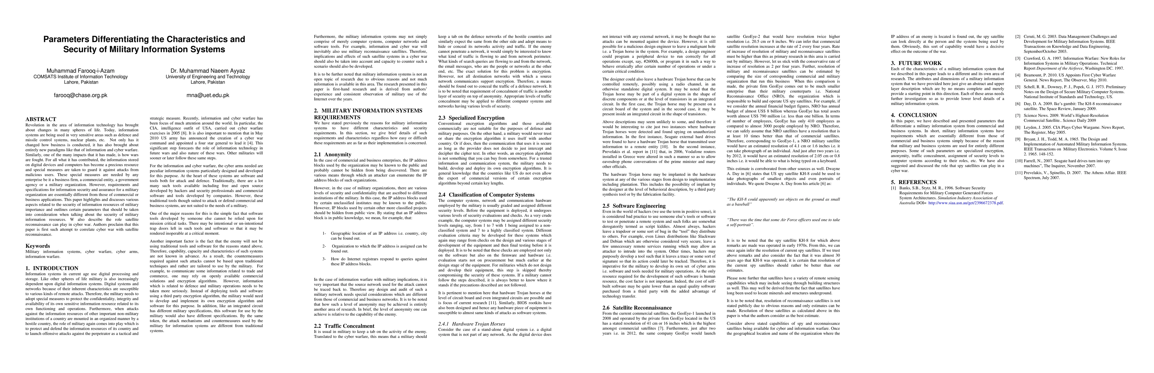 This paper explores the unique security requirements and parameters for military information systems, distinguishing them from commercial counterparts, and discusses the role of satellite reconnaissance in cyber warfare, marking the first attempt to correlate these two aspects.