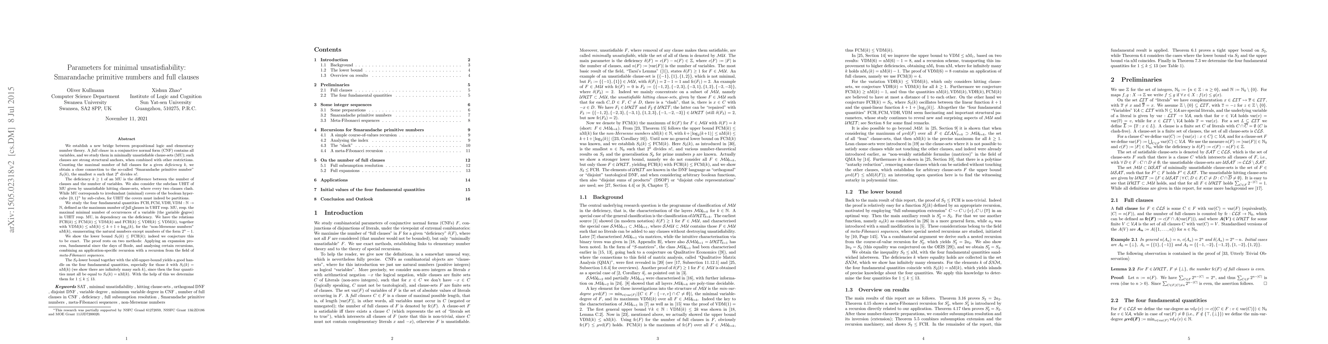 We establish a new bridge between propositional logic and elementary number theory. The main objects are "minimally unsatisfiable clause-sets", short "MUs", unsatisfiable conjunctive normal forms rendered satisfiable by elimination of any clause. In other words, irredundant coverings of the boolean hypercube by subcubes. The main parameter for MUs is the "deficiency" k, the difference between the number of clauses and the number of variables (the difference between the number of elements in the covering and the dimension of the hypercube), and the fundamental fact is that k >= 1 holds. A "full clause" in an MU contains all variables (corresponding to a singleton in the covering). We show the lower bound S_2(k) <= FCM(k), where FCM(k) is the maximal number of full clauses in MUs of deficiency k, while S_2(k) is the smallest n such that 2^k divides n!. The proof rests on two methods: On the logic-combinatorial side, applying subsumption resolution and its inverse, a fundamental method since Boole in 1854 introduced the "expansion method". On the arithmetical side, analysing certain recursions, combining an application-specific recursion with a recursion from the field of meta-Fibonacci sequences (indeed S_2 equals twice the Conolly sequence). A further tool is the consideration of unsatisfiable "hitting clause-sets" (UHITs), special cases of MUs, which correspond to the partitions of the boolean hypercube by subcubes; they are also known as orthogonal or disjoint DNF tautologies. We actually show the sharper lower bound S_2(k) <= FCH(k), where FCH(k) is the maximal number of full clauses in UHITs of deficiency k. We conjecture that for all k holds S_2(k) = FCH(k), which would establish a surprising connection between the extremal combinatorics of (un)satisfiability and elementary number theory. We apply the lower bound to analyse the structure of MUs and UHITs.
