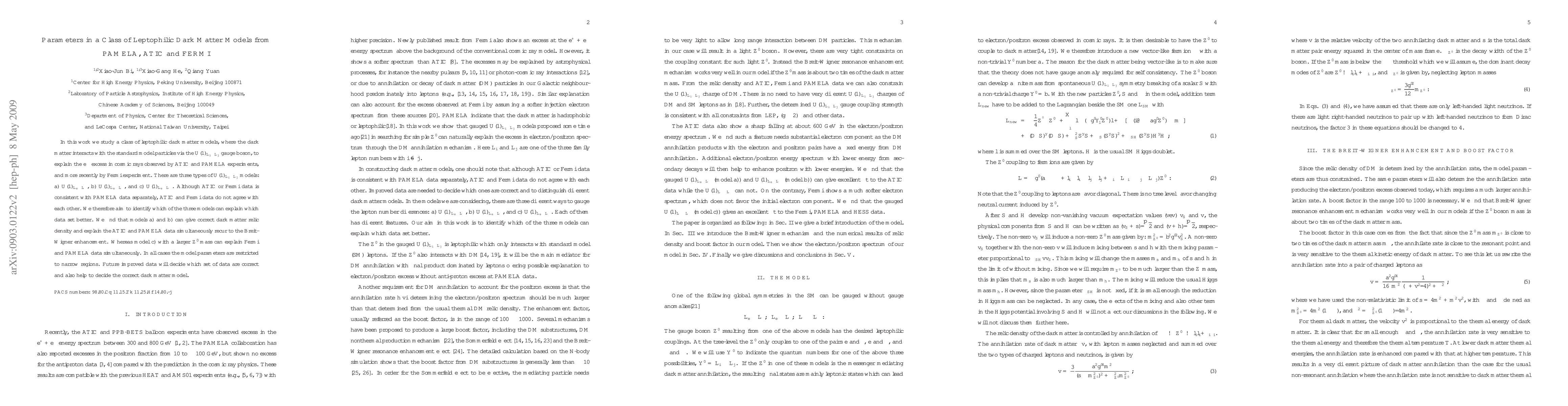 This paper investigates leptophilic dark matter models interacting via $U(1)_{L_i-L_j}$ gauge bosons to explain cosmic ray excesses observed by ATIC, PAMELA, and Fermi. The study finds that models a) and b) can explain ATIC and PAMELA data, while model c) can fit Fermi and PAMELA data, with parameters constrained to specific regions. Future data will determine the correct model.