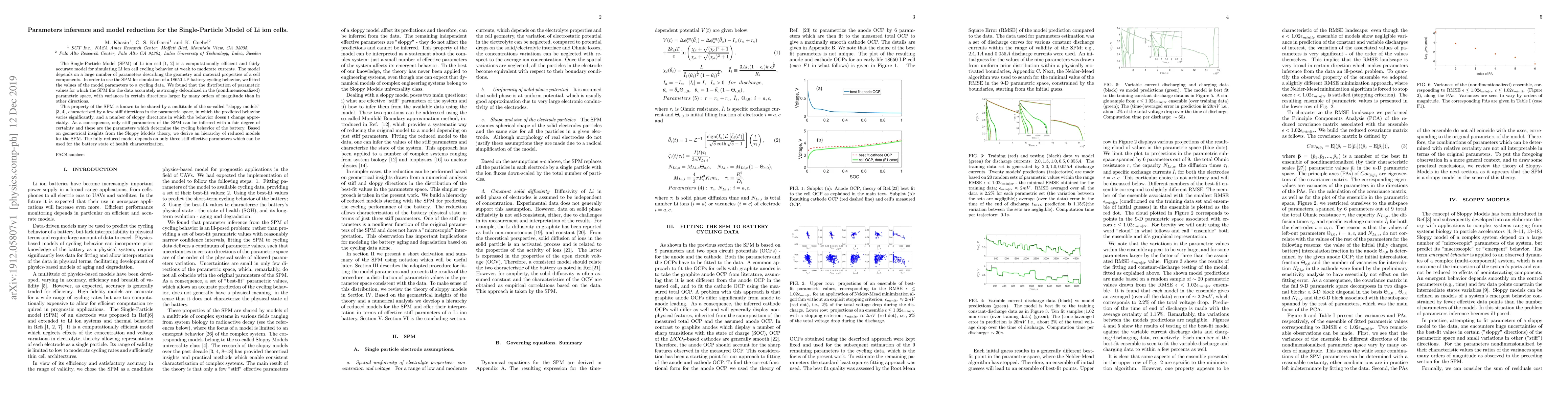 The Single-Particle Model (SPM) of Li ion cell \cite{Santhanagopalan06, Guo2011} is a computationally efficient and fairly accurate model for simulating Li ion cell cycling behavior at weak to moderate currents. The model depends on a large number of parameters describing the geometry and material properties of a cell components. In order to use the SPM for simulation of a 18650 LP battery cycling behavior, we fitted the values of the model parameters to a cycling data. We found that the distribution of parametric values for which the SPM fits the data accurately is strongly delocalized in the (nondimensionalized) parametric space, with variances in certain directions larger by many orders of magnitude than in other directions. This property of the SPM is known to be shared by a multitude of the so-called "sloppy models" \cite{Brown2003, Waterfall2006}, characterized by a few stiff directions in the parametric space, in which the predicted behavior varies significantly, and a number of sloppy directions in which the behavior doesn't change appreciably. As a consequence, only stiff parameters of the SPM can be inferred with a fair degree of certainty and these are the parameters which determine the cycling behavior of the battery. Based on geometrical insights from the Sloppy Models theory, we derive an hierarchy of reduced models for the SPM. The fully reduced model depends on only three stiff effective parameters which can be used for the battery state of health characterization.