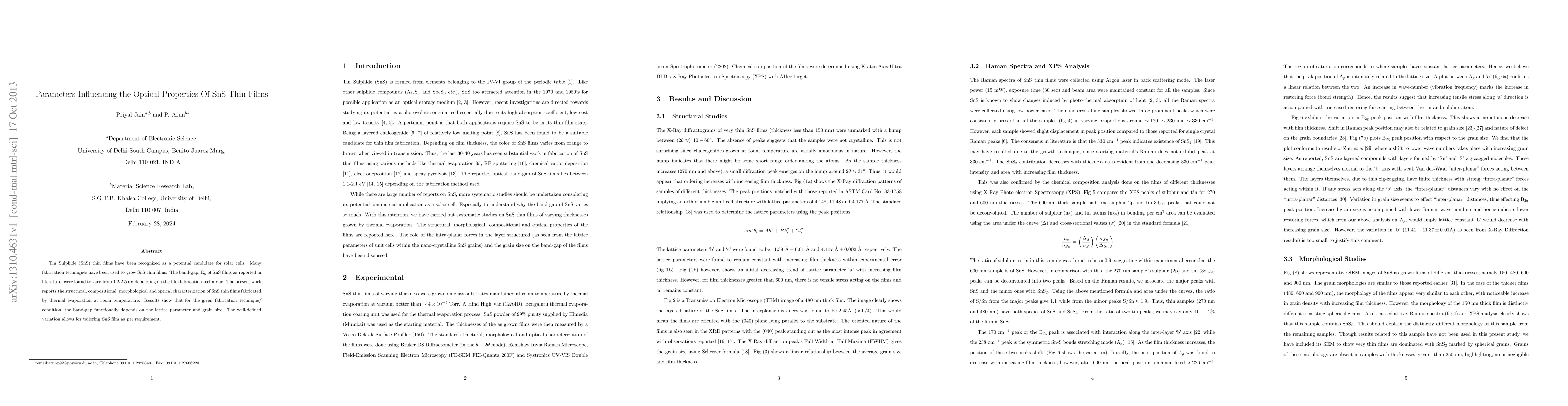 This paper investigates the optical properties of SnS thin films fabricated via thermal evaporation, finding that the band-gap varies with lattice parameter and grain size, enabling tailored fabrication for solar cell applications.