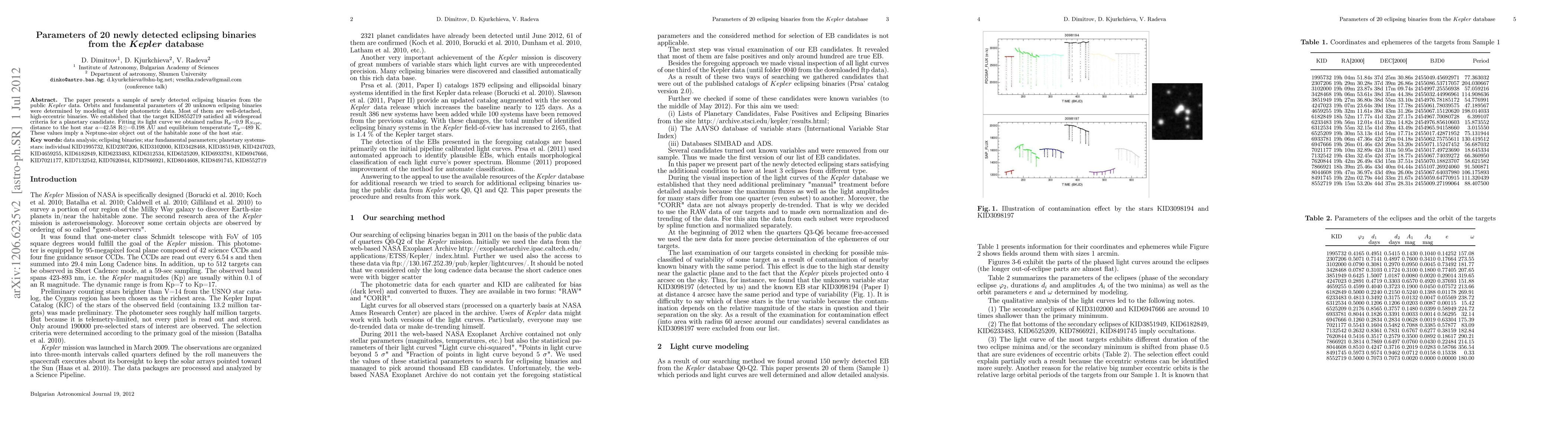 The paper identifies and analyzes 20 newly detected eclipsing binaries from Kepler data, revealing mostly well-detached, high-eccentric orbits. One target, KID8552719, shows potential as a planetary candidate with characteristics suggesting a Neptune-sized object beyond the host star's habitable zone.