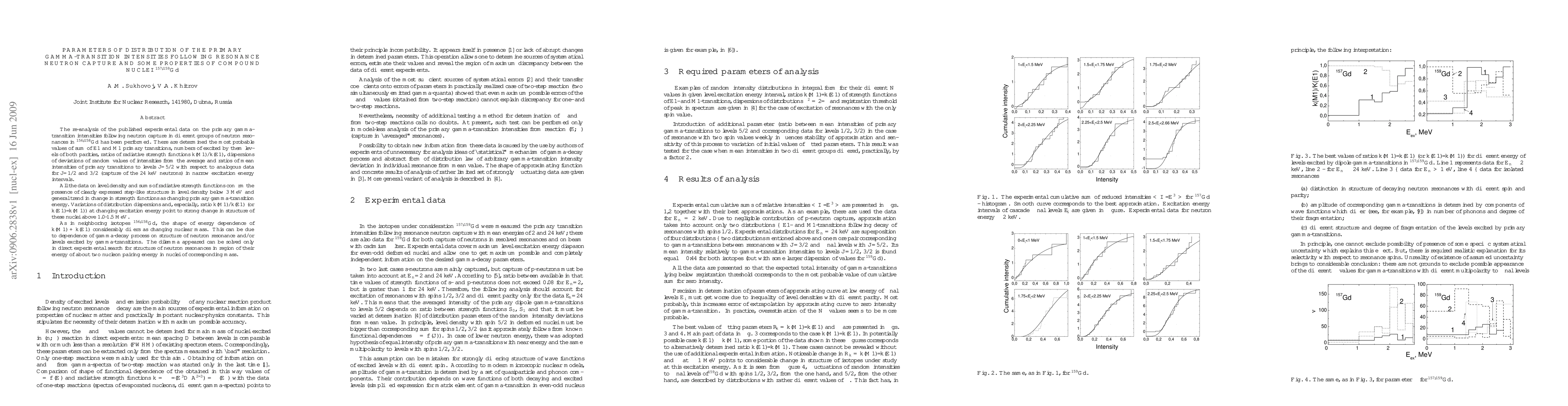 The re-analysis of the published experimental data on the primary gamma-transition intensities following neutron capture in different groups of neutron resonances in $^{156,158}$Gd has been performed. There are determined the most probable values of sum of E1 and M1 primary transitions, numbers of excited by them levels of both parities, ratios of radiative strength functions k(M1)/k(E1), dispersions of deviations of random values of intensities from the average and ratios of mean intensities of primary transitions to levels J=5/2 with respect to analogous data for J=1/2 and 3/2 (capture of the 24 keV neutrons) in narrow excitation energy intervals. All the data on level density and sums of radiative strength functions confirm the presence of clearly expressed step-like structure in level density below 3 MeV and general trend in change in strength functions as changing primary gamma-transition energy. Variations of distribution dispersions and, especially, ratio k(M1)/k(E1) (or $k(E1)/k(M1)$) at changing excitation energy point to strong change in structure of these nuclei above 1.0-1.5 MeV.