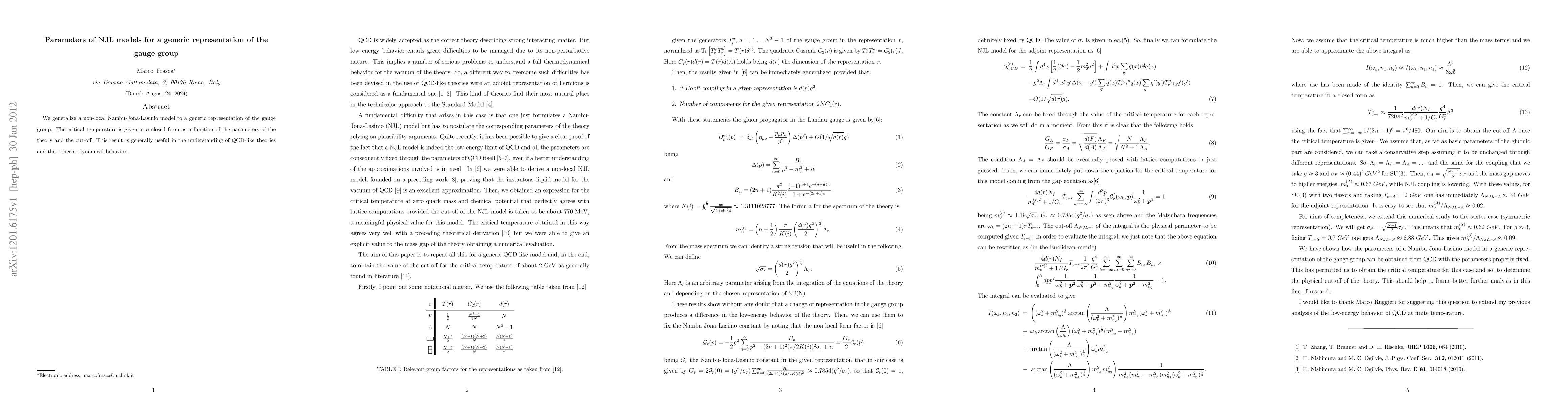 Researchers generalized a non-local Nambu-Jona-Lasinio model to represent various gauge groups, finding that the critical temperature can be expressed in closed form for general theory parameters and cut-offs.