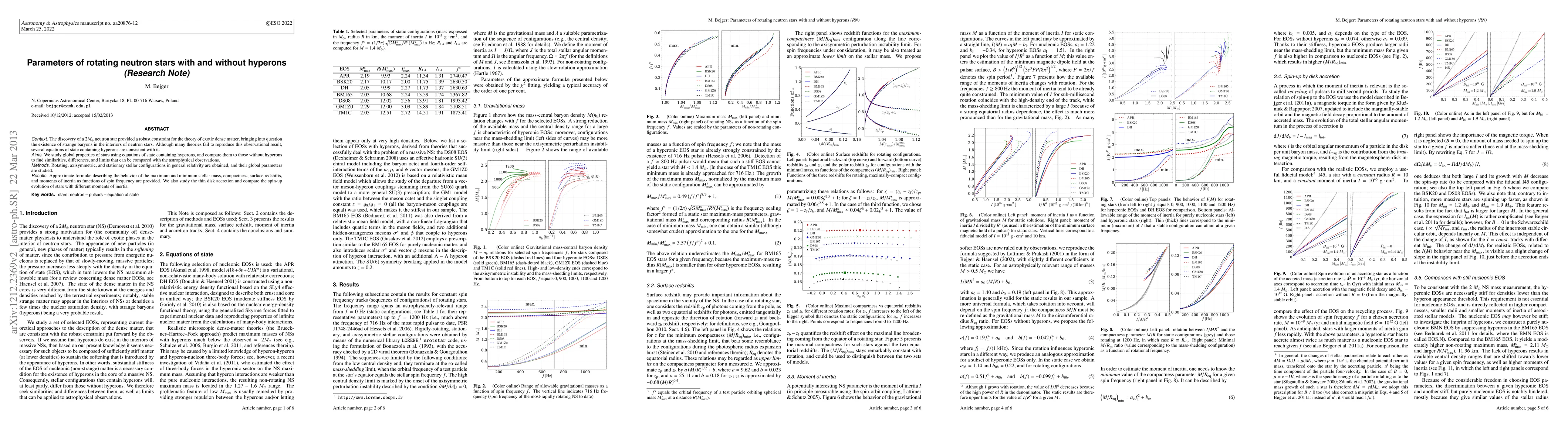 This paper investigates the global properties of rotating neutron stars with and without hyperons, comparing their mass, compactness, and moments of inertia. It provides equations of state consistent with observed 2 Msun neutron stars and derives approximate formulae for these parameters, also examining thin disk accretion and spin-up evolution.