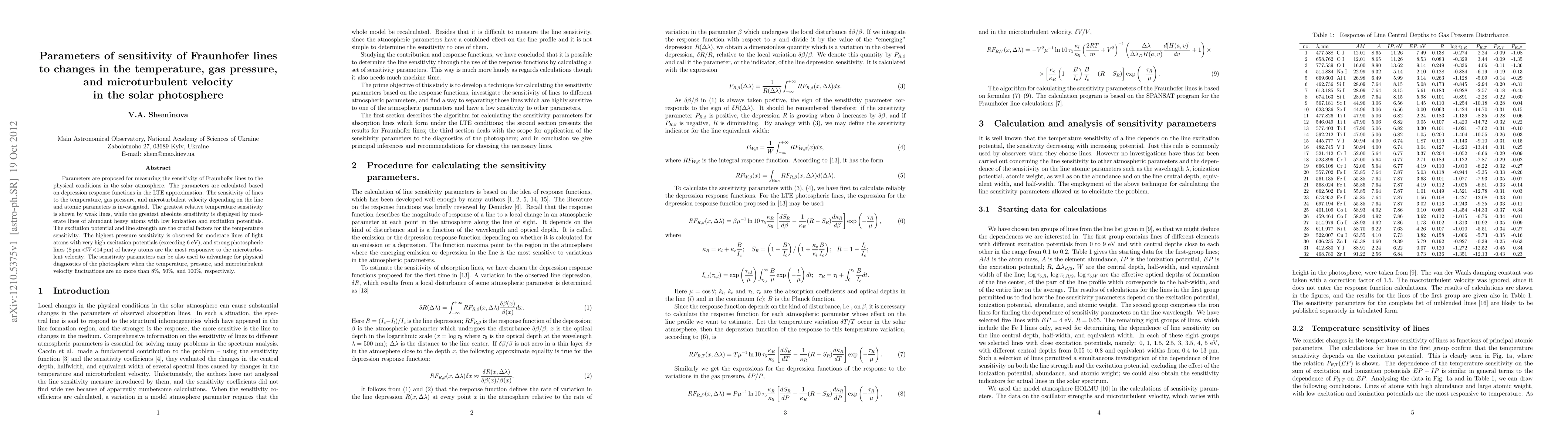 This paper proposes parameters to measure the sensitivity of Fraunhofer lines to temperature, gas pressure, and microturbulent velocity in the solar photosphere. The greatest relative temperature sensitivity is shown by weak lines, while moderate lines of abundant heavy atoms exhibit the highest absolute sensitivity.