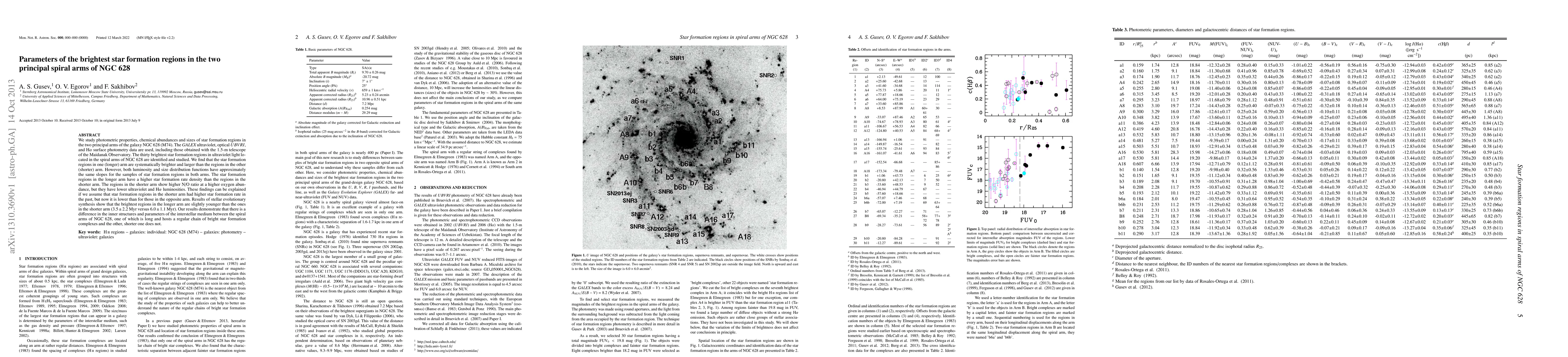 We study photometric properties, chemical abundances and sizes of star formation regions in the two principal arms of the galaxy NGC 628 (M74). The GALEX ultraviolet, optical UBVRI, and H-alpha? surface photometry data are used, including those obtained with the 1.5-m telescope of the Maidanak Observatory. The thirty brightest star formation regions in ultraviolet light located in the spiral arms of NGC 628 are identified and studied. We find that the star formation regions in one (longer) arm are systematically brighter and larger than the regions in the other (shorter) arm. However, both luminosity and size distribution functions have approximately the same slopes for the samples of star formation regions in both arms. The star formation regions in the longer arm have a higher star formation rate density than the regions in the shorter arm. The regions in the shorter arm show higher N/O ratio at a higher oxygen abundance, but they have lower ultraviolet and H-alpha? luminosities. These findings can be explained if we assume that star formation regions in the shorter arm had higher star formation rate in the past, but now it is lower than for those in the opposite arm. Results of stellar evolutionary synthesis show that the brightest regions in the longer arm are slightly younger than the ones in the shorter arm (3.5+-2.2 Myr versus 6.0+-1.1 Myr). Our results demonstrate that there is a difference in the inner structures and parameters of the interstellar medium between the spiral arms of NGC 628, one of which is long and hosts a regular chain of bright star formation complexes and the other, shorter one does not.