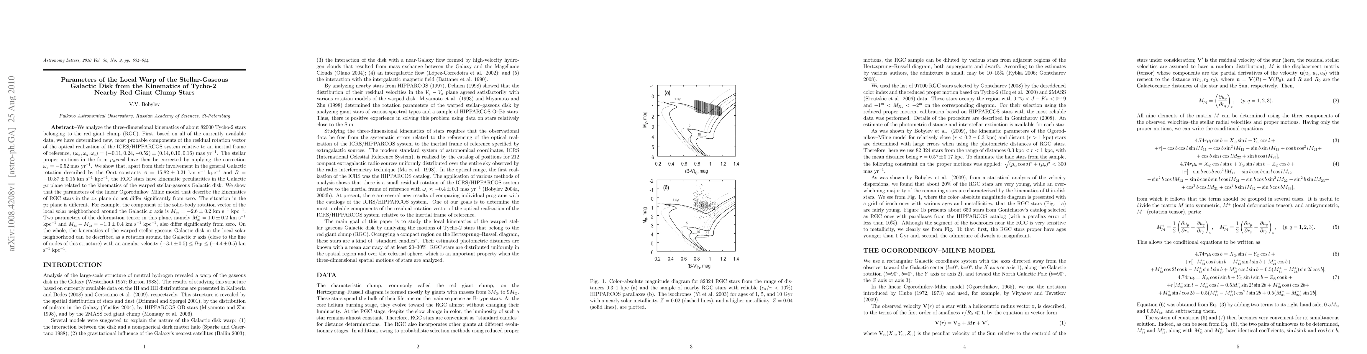 This paper analyzes the kinematics of Tycho-2 red giant clump stars to determine the local warp of the stellar-gaseous Galactic disk, revealing significant deviations from general Galactic rotation, particularly in the yz plane, with notable parameters indicating a complex warp structure.