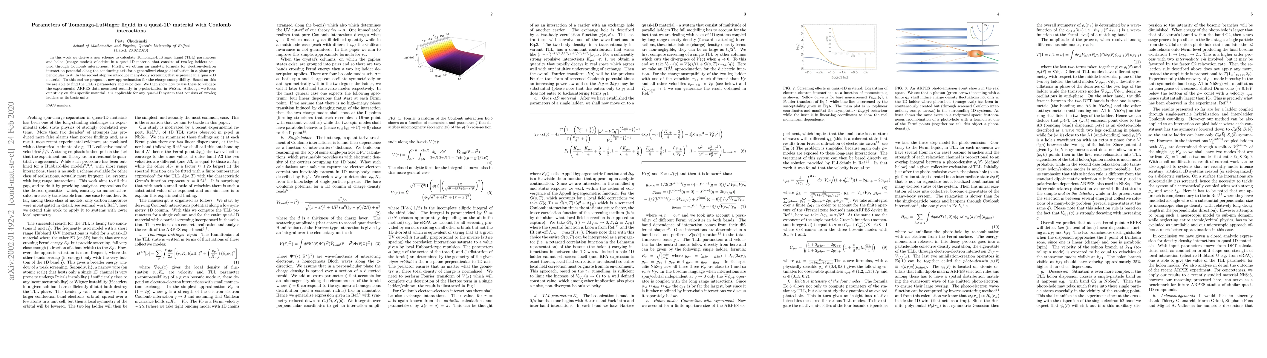 This paper develops a new method to calculate Tomonaga-Luttinger liquid parameters and holon velocities in quasi-1D materials with Coulomb interactions, specifically for two-leg ladder systems. The authors propose an analytic formula for electron-electron interaction potential and a new approximation for charge susceptibility, enabling the determination of these parameters and their validation against recent ARPES data in $NbSe_3$.