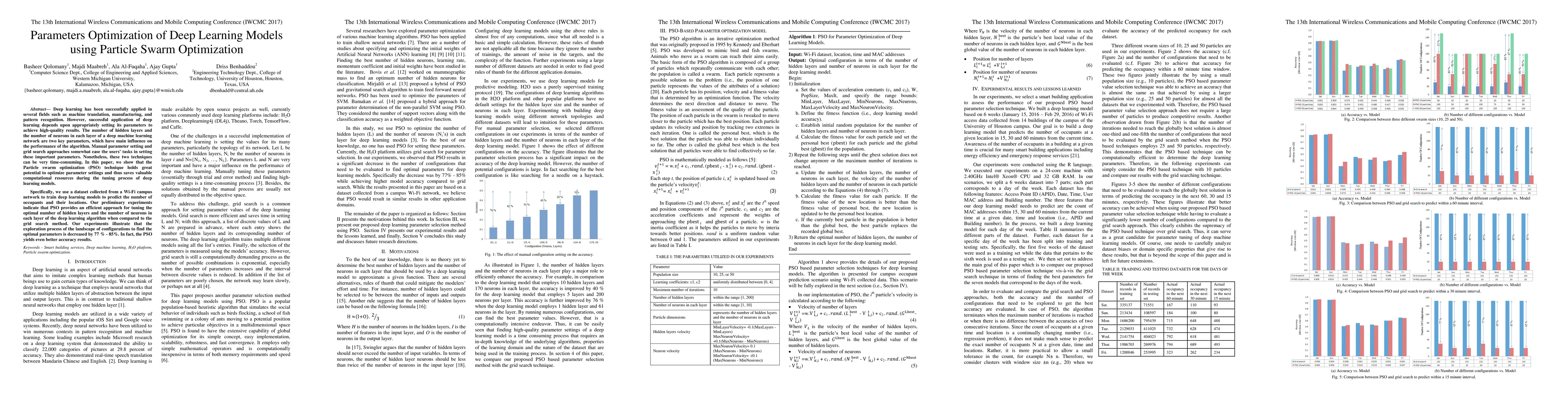 This paper explores using Particle Swarm Optimization (PSO) to optimize parameters in deep learning models, specifically the number of hidden layers and neurons, to improve performance and reduce computational time compared to traditional grid search methods. Preliminary results show PSO reduces the exploration process by 77%-85% and yields better accuracy in predicting occupant numbers and locations in a Wi-Fi campus network.