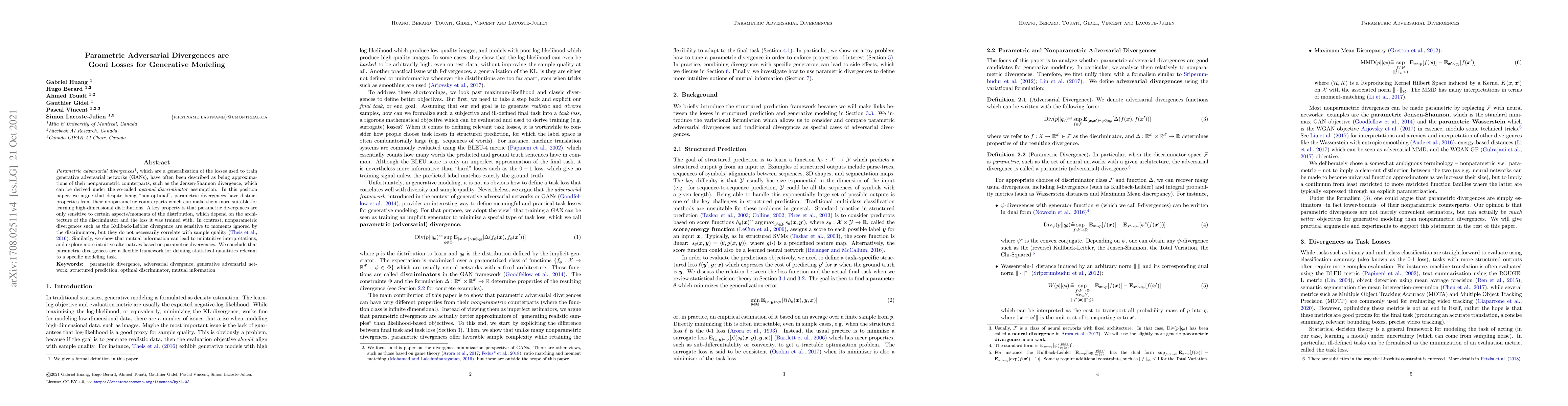 Parametric adversarial divergences, which are a generalization of the losses used to train generative adversarial networks (GANs), have often been described as being approximations of their nonparametric counterparts, such as the Jensen-Shannon divergence, which can be derived under the so-called optimal discriminator assumption. In this position paper, we argue that despite being "non-optimal", parametric divergences have distinct properties from their nonparametric counterparts which can make them more suitable for learning high-dimensional distributions. A key property is that parametric divergences are only sensitive to certain aspects/moments of the distribution, which depend on the architecture of the discriminator and the loss it was trained with. In contrast, nonparametric divergences such as the Kullback-Leibler divergence are sensitive to moments ignored by the discriminator, but they do not necessarily correlate with sample quality (Theis et al., 2016). Similarly, we show that mutual information can lead to unintuitive interpretations, and explore more intuitive alternatives based on parametric divergences. We conclude that parametric divergences are a flexible framework for defining statistical quantities relevant to a specific modeling task.