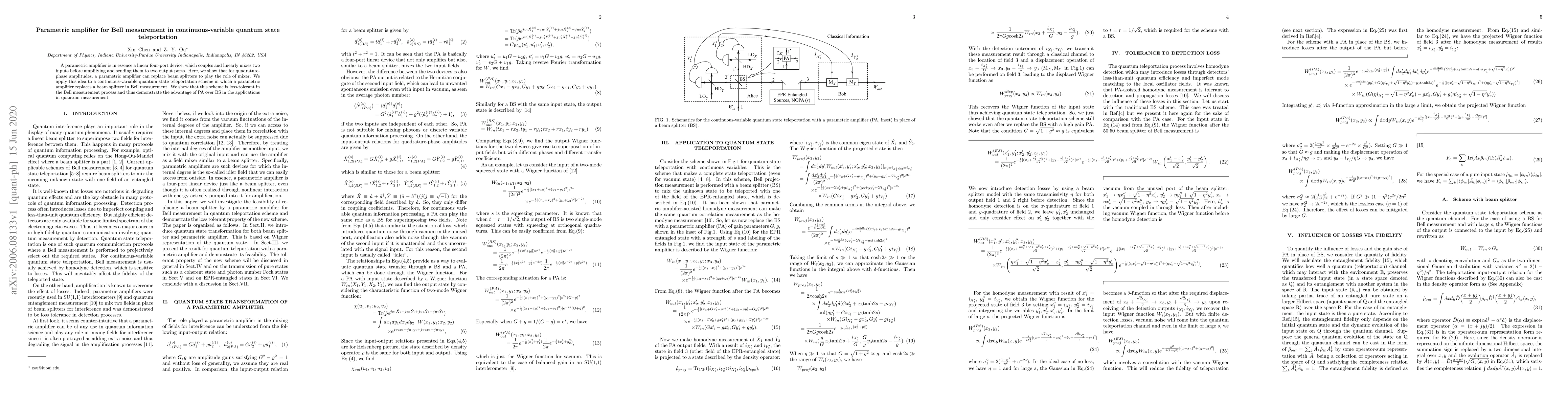 This paper demonstrates that a parametric amplifier can replace beam splitters in continuous-variable quantum state teleportation, particularly in Bell measurement, showing improved loss tolerance and thus an advantage over traditional beam splitters.