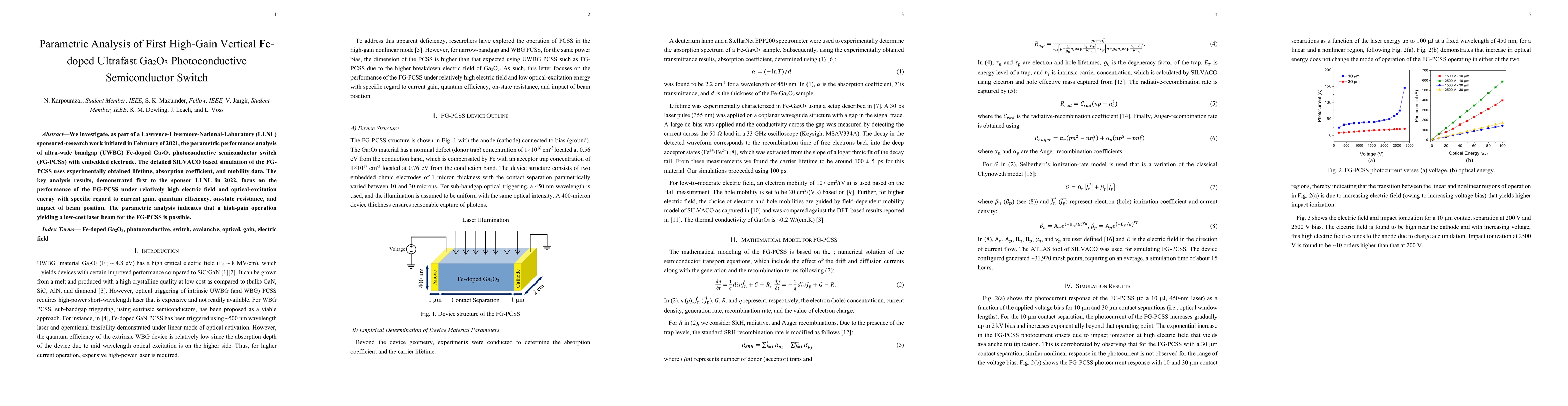 We investigate, as part of a Lawrence-Livermore-National-Laboratory (LLNL) sponsored-research work initiated in February of 2021, the parametric performance analysis of ultra-wide bandgap (UWBG) Fe-doped Ga2O3 photoconductive semiconductor switch (FG-PCSS) with embedded electrode. The detailed SILVACO based simulation of the FG-PCSS uses experimentally obtained lifetime, absorption coefficient, and mobility data. The key analysis results, demonstrated first to the sponsor LLNL in 2022, focus on the performance of the FG-PCSS under relatively high electric field and optical-excitation energy with specific regard to current gain, quantum efficiency, on-state resistance, and impact of beam position. The parametric analysis indicates that a high-gain operation yielding a low-cost laser beam for the FG-PCSS is possible.
