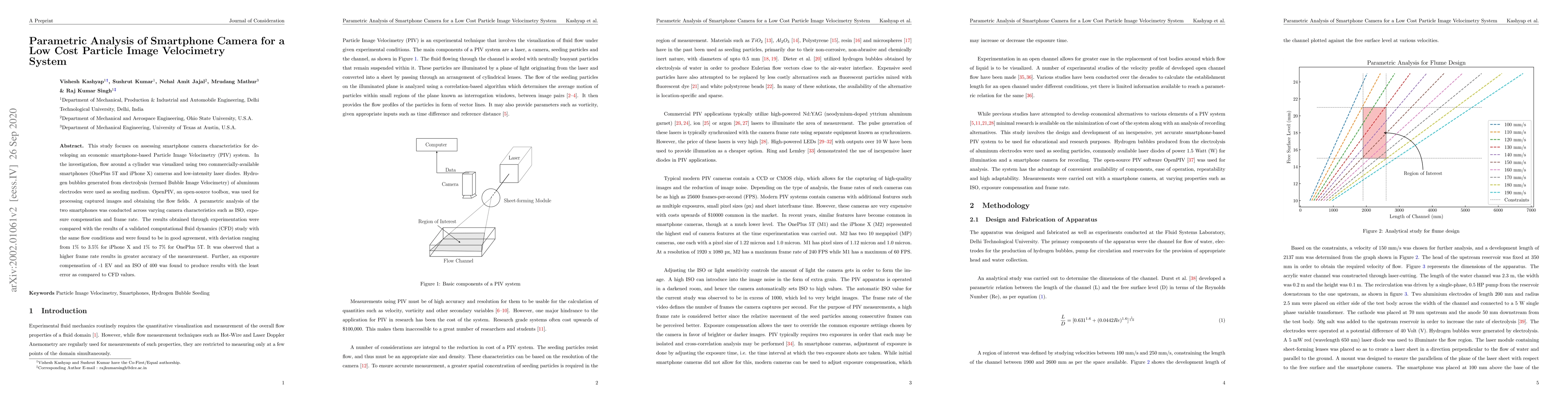 This study focuses on assessing smartphone camera characteristics for developing an economic smartphone-based Particle Image Velocimetry (PIV) system. In the investigation, flow around a cylinder was visualized using two commercially-available smartphones (OnePlus 5T and iPhone X) cameras and low-intensity laser diodes. Hydrogen bubbles generated from electrolysis (termed Bubble Image Velocimetry) of aluminum electrodes were used as seeding medium. OpenPIV, an open-source toolbox, was used for processing captured images and obtaining the flow fields. A parametric analysis of the two smartphones was conducted across varying camera characteristics such as ISO, exposure compensation and frame rate. The results obtained through experimentation were compared with the results of a validated computational fluid dynamics (CFD) study with the same flow conditions and were found to be in good agreement, with deviation ranging from 1% to 3.5% for iPhone X and 1% to 7% for OnePlus 5T. It was observed that a higher frame rate results in greater accuracy of the measurement. Further, an exposure compensation of -1 EV and an ISO of 400 was found to produce results with the least error as compared to CFD values.