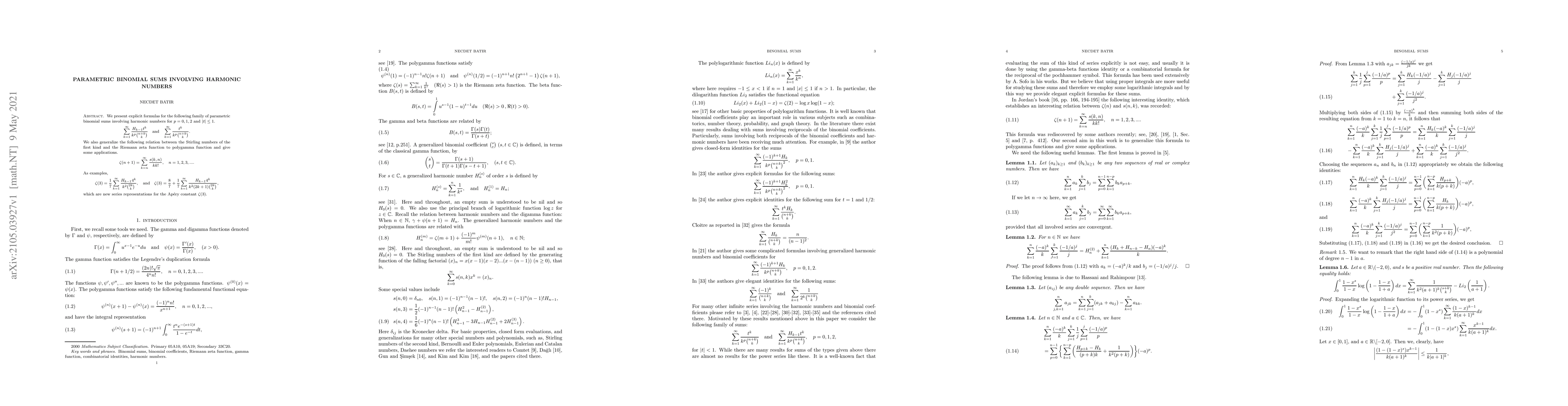 We present explicit formulas for the following family of parametric binomial sums involving harmonic numbers for $p=0,1,2$ and $|t|\leq1$. $$ \sum_{k=1}^{\infty}\frac{H_{k-1}t^k}{k^p\binom{n+k}{k}}\quad \mbox{and}\quad \sum_{k=1}^{\infty}\frac{t^k}{k^p\binom{n+k}{k}}. $$ We also generalize the following relation between the Stirling numbers of the first kind and the Riemann zeta function to polygamma function and give some applications. $$ \zeta(n+1)=\sum_{k=n}^{\infty}\frac{s(k,n)}{kk!}, \quad n=1,2,3,... . $$ As examples, \begin{equation*} \zeta(3)=\frac{1}{7}\sum_{k=1}^{\infty}\frac{H_{k-1}4^k}{k^2\binom{2k}{k}},\quad \mbox{and}\quad \zeta(3)=\frac{8}{7}+\frac{1}{7}\sum_{k=1}^{\infty}\frac{H_{k-1}4^k}{k^2(2k+1)\binom{2k}{k}}, \end{equation*} which are new series representations for the Ap\'{e}ry constant $\zeta(3)$.
