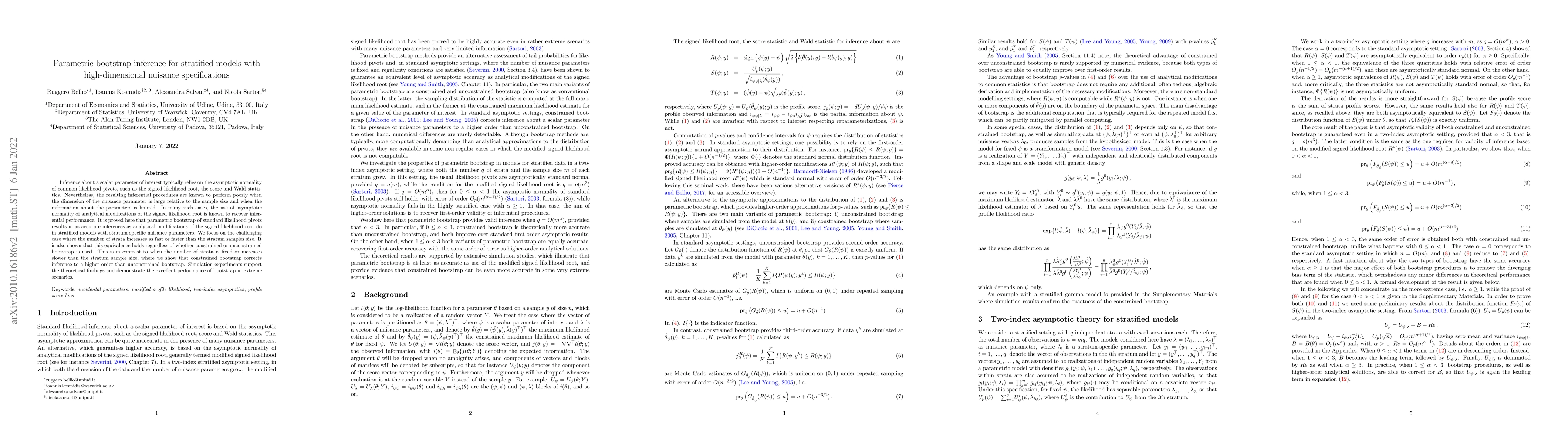 The paper proves the equivalence in accuracy between parametric bootstrap methods and analytical modifications for high-dimensional nuisance parameters in stratified models, providing a viable alternative to traditional inferential techniques in such complex settings.