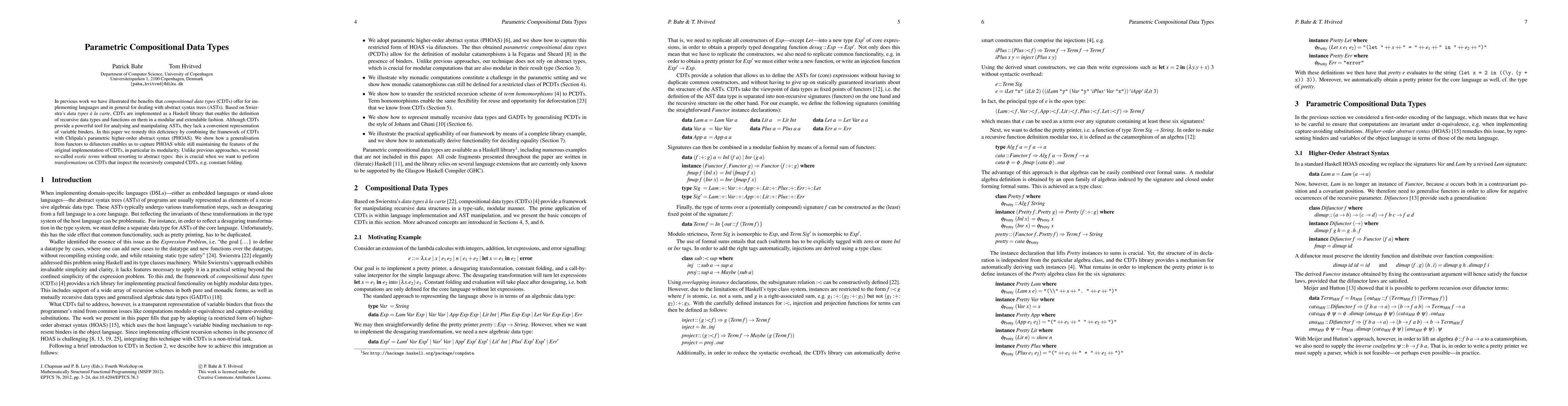 This paper improves compositional data types (CDTs) with parametric higher-order abstract syntax (PHOAS) by generalizing functors to difunctors, enabling variable binder representation while maintaining modularity and avoiding exotic terms.