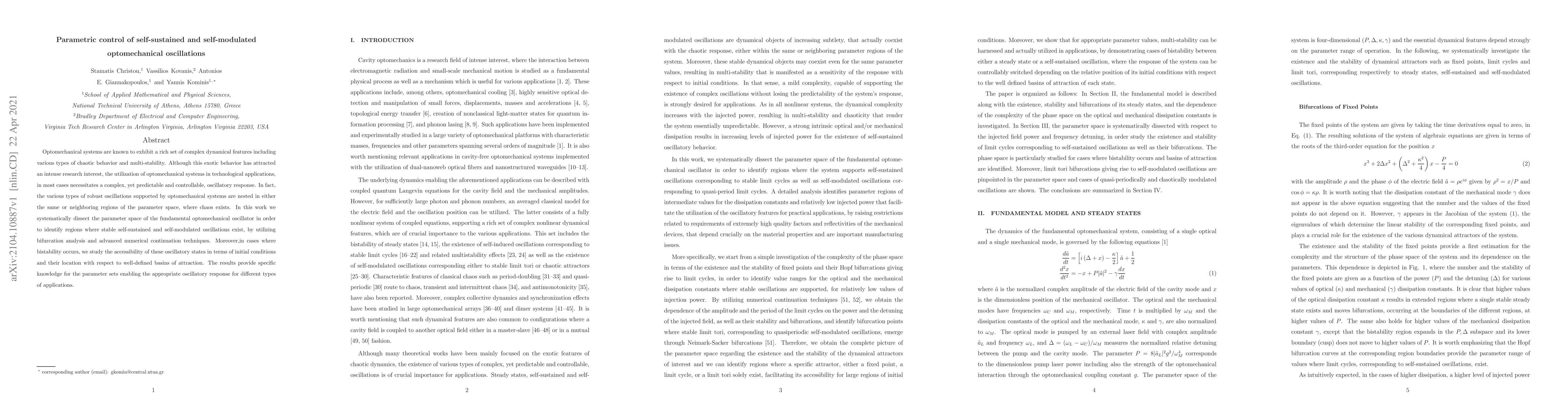 Optomechanical systems are known to exhibit a rich set of complex dynamical features including various types of chaotic behavior and multi-stability. Although this exotic behavior has attracted an intense research interest, the utilization of optomechanical systems in technological applications, in most cases necessitates a complex, yet predictable and controllable, oscillatory response. In fact, the various types of robust oscillations supported by optomechanical systems are nested in either the same or neighboring regions of the parameter space, where chaos exists. In this work we systematically dissect the parameter space of the fundamental optomechanical oscillator in order to identify regions where stable self-sustained and self-modulated oscillations exist, by utilizing bifurcation analysis and advanced numerical continuation techniques. Moreover,in cases where bistability occurs, we study the accessibility of these oscillatory states in terms of initial conditions and their location with respect to well-defined basins of attraction. The results provide specific knowledge for the parameter sets enabling the appropriate oscillatory response for different types of applications.