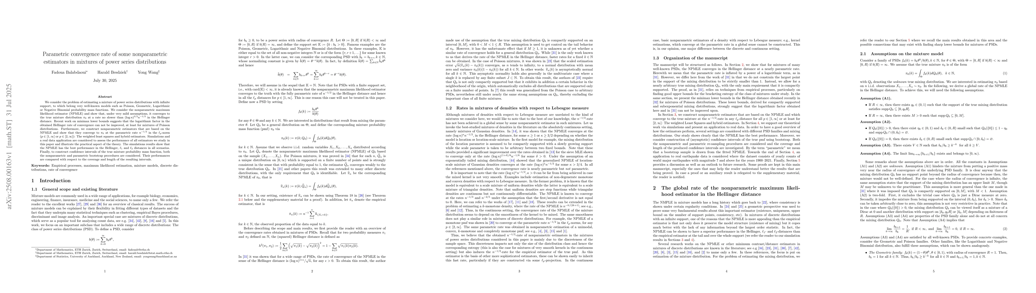 We consider the problem of estimating a mixture of power series distributions with infinite support, to which belong very well-known models such as Poisson, Geometric, Logarithmic or Negative Binomial probability mass functions. We consider the nonparametric maximum likelihood estimator (NPMLE) and show that, under very mild assumptions, it converges to the true mixture distribution $\pi_0$ at a rate no slower than $(\log n)^{3/2} n^{-1/2}$ in the Hellinger distance. Recent work on minimax lower bounds suggests that the logarithmic factor in the obtained Hellinger rate of convergence can not be improved, at least for mixtures of Poisson distributions. Furthermore, we construct nonparametric estimators that are based on the NPMLE and show that they converge to $\pi_0$ at the parametric rate $n^{-1/2}$ in the $\ell_p$-norm ($p \in [1, \infty]$ or $p \in [2, \infty])$: The weighted least squares and hybrid estimators. Simulations and a real data application are considered to assess the performance of all estimators we study in this paper and illustrate the practical aspect of the theory. The simulations results show that the NPMLE has the best performance in the Hellinger, $\ell_1$ and $\ell_2$ distances in all scenarios. Finally, to construct confidence intervals of the true mixture probability mass function, both the nonparametric and parametric bootstrap procedures are considered. Their performances are compared with respect to the coverage and length of the resulting intervals.