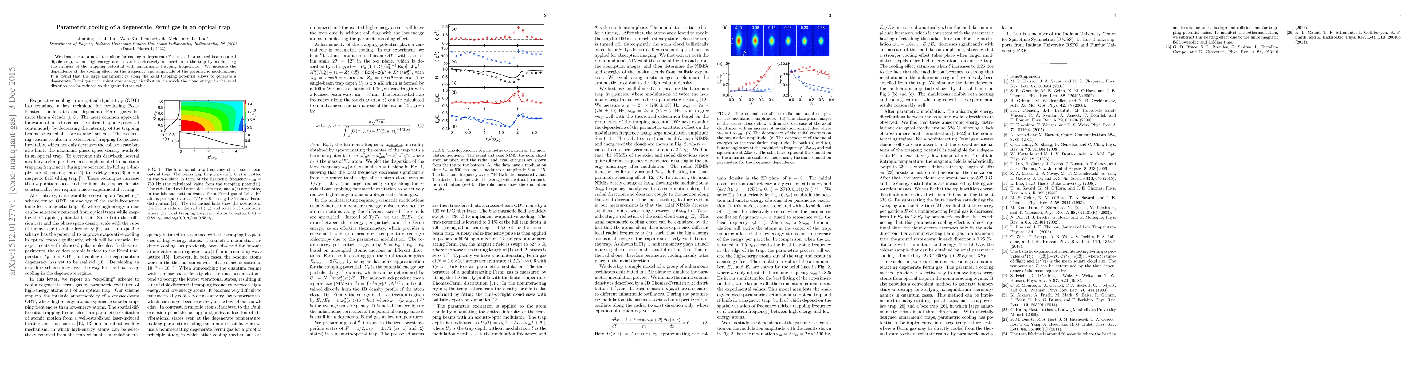 This paper presents a method for cooling a degenerate Fermi gas using an optical dipole trap with modulated anharmonic frequencies, achieving a significant reduction in axial cloud energy to ground state levels. The effectiveness of the cooling technique is shown to depend on the frequency and amplitude of the parametric modulations.