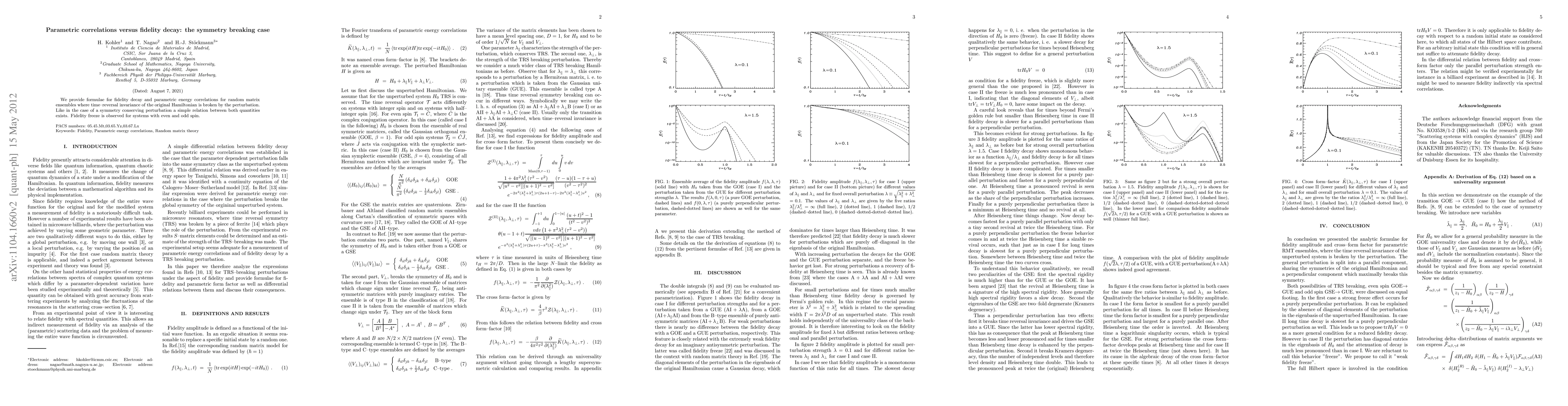We derive fidelity decay and parametric energy correlations for random matrix ensembles where time--reversal invariance of the original Hamiltonian is broken by the perturbation. Like in the case of a symmetry conserving perturbation a simple relation between both quantities can be established.