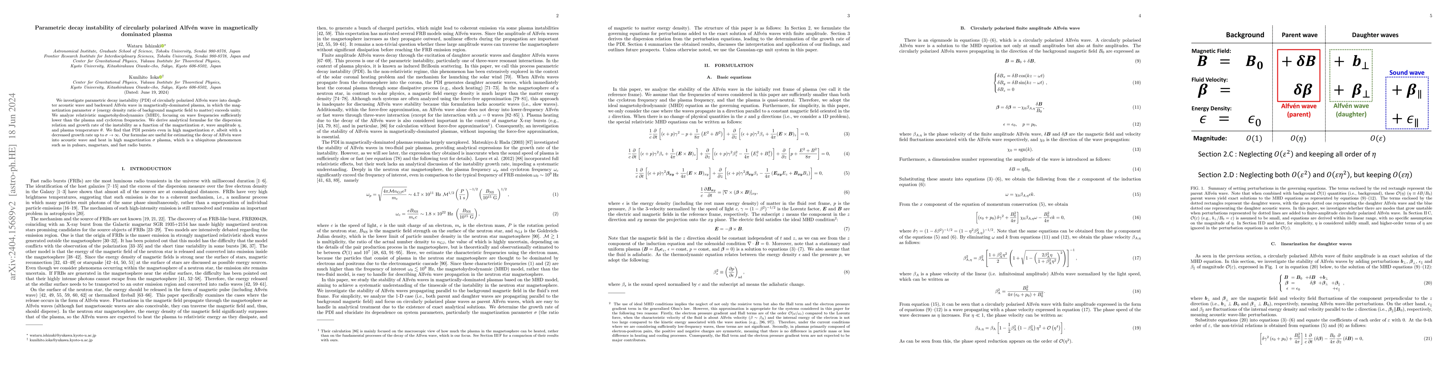This research examines the parametric decay instability of circularly polarized Alfvén waves in magnetically-dominated plasma, deriving analytical expressions for its dispersion relation and growth rate. Despite high magnetization, the instability persists, albeit with reduced growth, relevant for phenomena in pulsars, magnetars, and fast radio bursts.