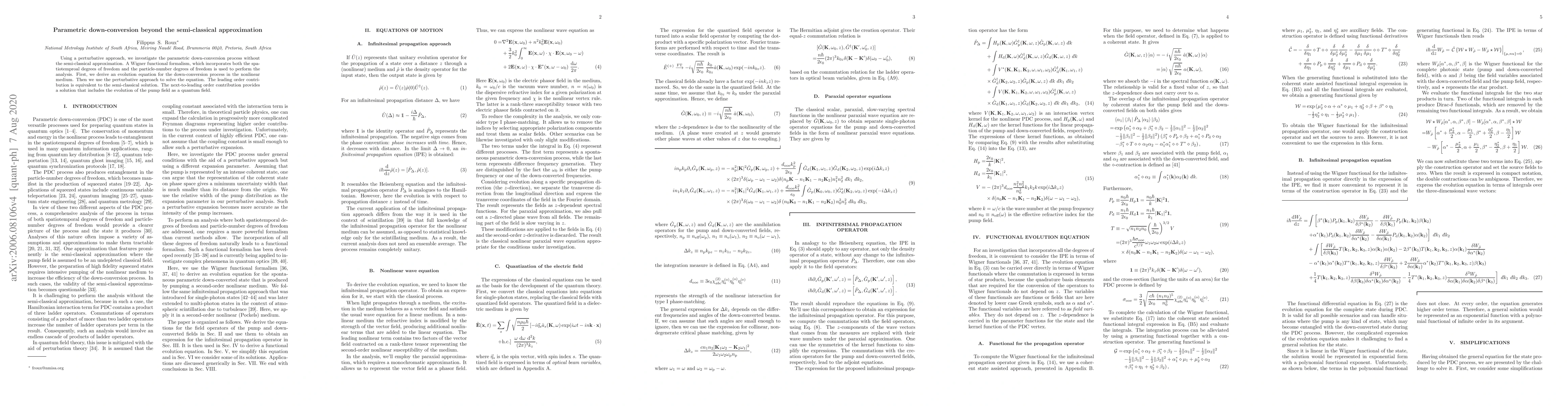 Using a perturbative approach, we investigate the parametric down-conversion process without the semi-classical approximation. A Wigner functional formalism, which incorporates both the spatiotemproal degrees of freedom and the particle-number degrees of freedom is used to perform the analysis. First, we derive an evolution equation for the down-conversion process in the nonlinear medium. Then we use the perturbative approach to solve the equation. The leading order contribution is equivalent to the semi-classical solution. The next-to-leading order contribution provides a solution that includes the evolution of the pump field as a quantum field.