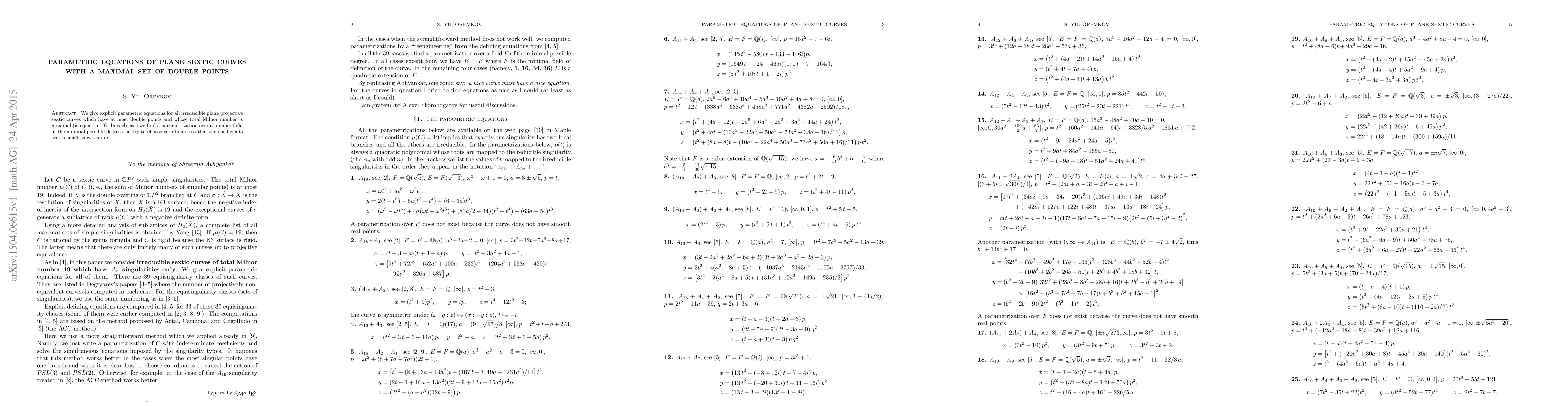 We give explicit parametric equations for all irreducible plane projective sextic curves which have at most double points and whose total Milnor number is maximal (is equal to 19). In each case we find a parametrization over a number field of the minimal possible degree and try to choose coordinates so that the coefficients are as small as we can do.