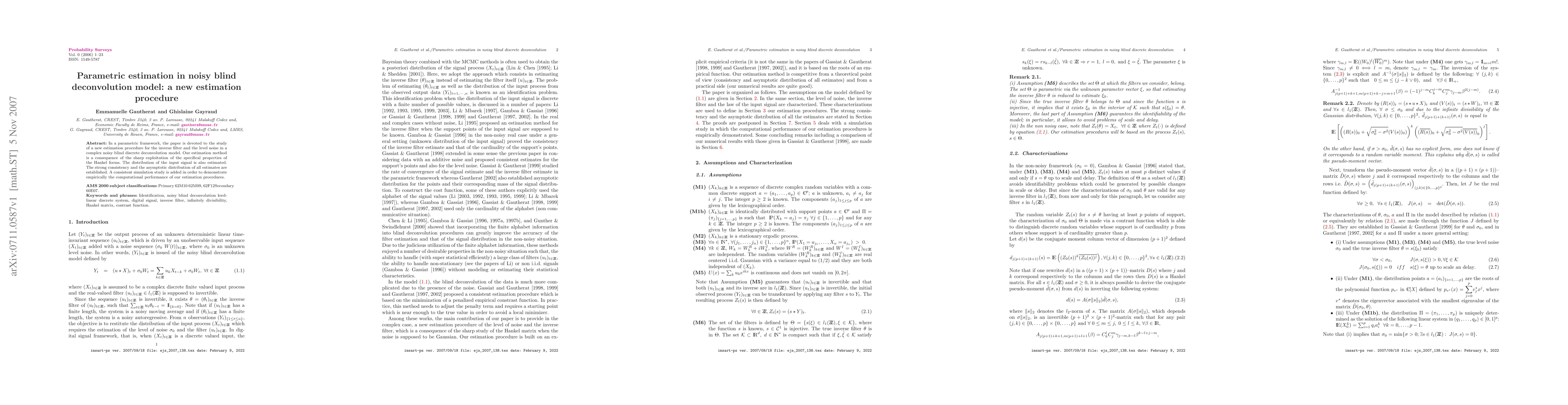A new estimation procedure for a noisy blind deconvolution model is proposed, leveraging Hankel forms to estimate the inverse filter and noise level with strong consistency and asymptotic distribution properties, demonstrated through simulation studies.