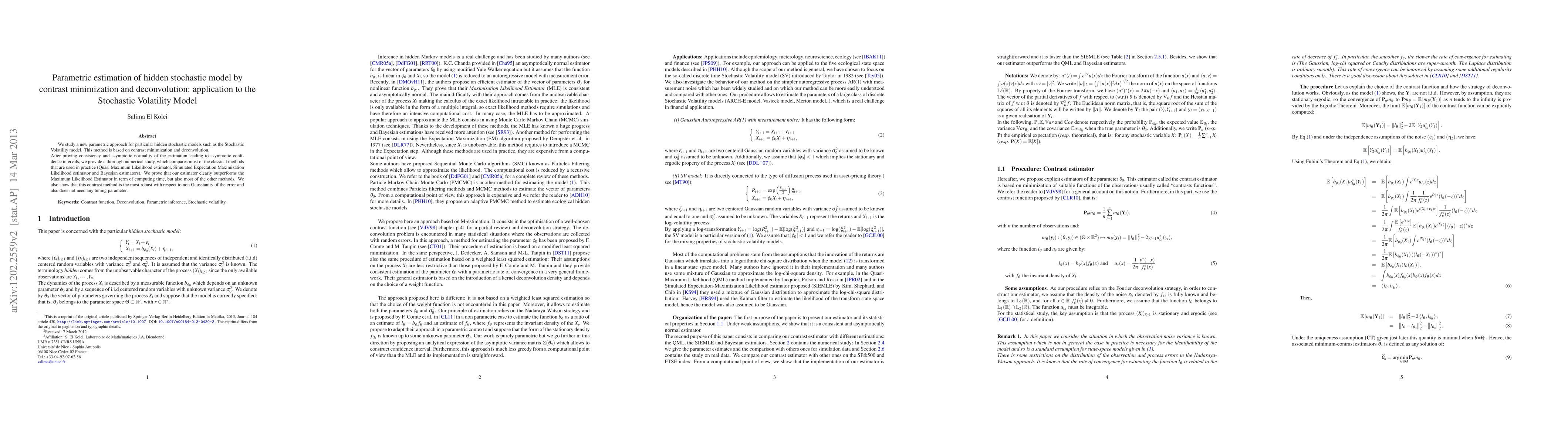 We study a new parametric approach for particular hidden stochastic models such as the Stochastic Volatility model. This method is based on contrast minimization and deconvolution. After proving consistency and asymptotic normality of the estimation leading to asymptotic confidence intervals, we provide a thorough numerical study, which compares most of the classical methods that are used in practice (Quasi Maximum Likelihood estimator, Simulated Expectation Maximization Likelihood estimator and Bayesian estimators). We prove that our estimator clearly outperforms the Maximum Likelihood Estimator in term of computing time, but also most of the other methods. We also show that this contrast method is the most robust with respect to non Gaussianity of the error and also does not need any tuning parameter.