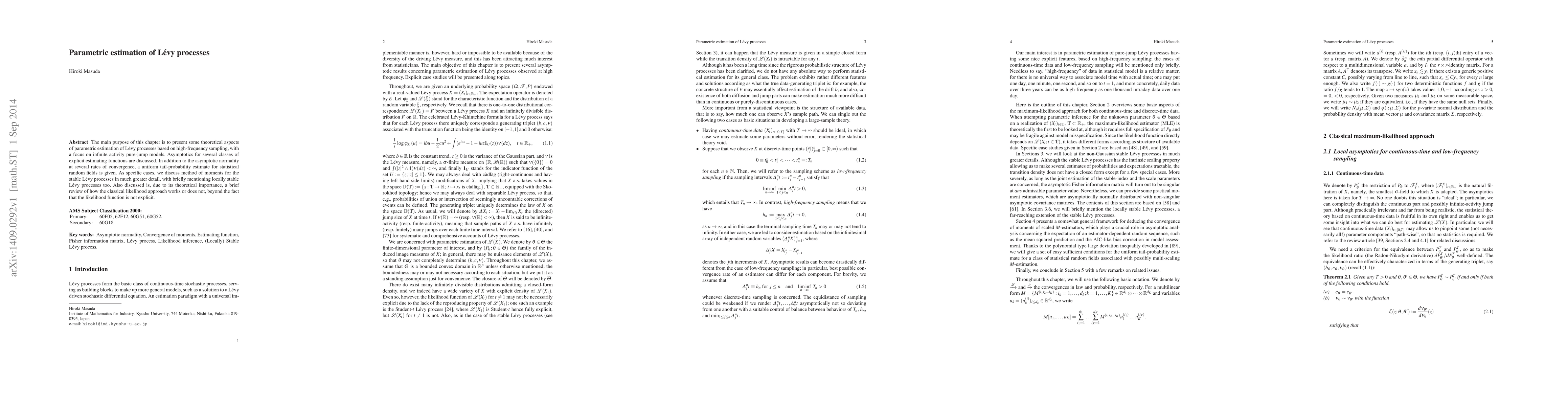 This paper explores parametric estimation techniques for Lévy processes, particularly focusing on high-frequency sampling of infinite activity pure-jump models. It discusses asymptotic properties and uniform tail-probability estimates for various estimating functions, with detailed attention to the method of moments for stable Lévy processes.