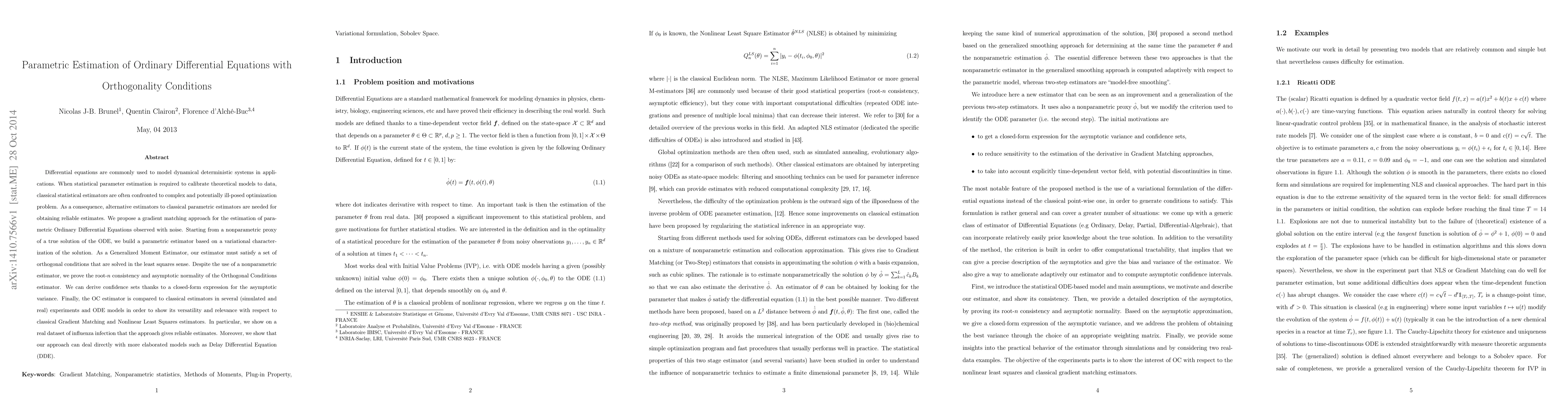 Differential equations are commonly used to model dynamical deterministic systems in applications. When statistical parameter estimation is required to calibrate theoretical models to data, classical statistical estimators are often confronted to complex and potentially ill-posed optimization problem. As a consequence, alternative estimators to classical parametric estimators are needed for obtaining reliable estimates. We propose a gradient matching approach for the estimation of parametric Ordinary Differential Equations observed with noise. Starting from a nonparametric proxy of a true solution of the ODE, we build a parametric estimator based on a variational characterization of the solution. As a Generalized Moment Estimator, our estimator must satisfy a set of orthogonal conditions that are solved in the least squares sense. Despite the use of a nonparametric estimator, we prove the root-$n$ consistency and asymptotic normality of the Orthogonal Conditions estimator. We can derive confidence sets thanks to a closed-form expression for the asymptotic variance. Finally, the OC estimator is compared to classical estimators in several (simulated and real) experiments and ODE models in order to show its versatility and relevance with respect to classical Gradient Matching and Nonlinear Least Squares estimators. In particular, we show on a real dataset of influenza infection that the approach gives reliable estimates. Moreover, we show that our approach can deal directly with more elaborated models such as Delay Differential Equation (DDE).