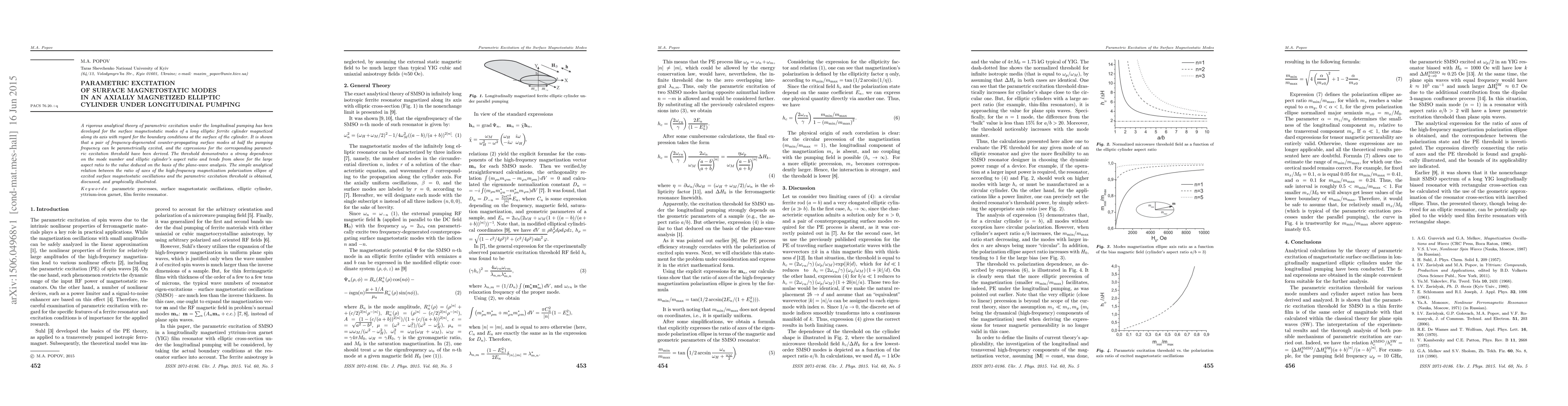 A rigorous analytical theory of parametric excitation under the longitudinal pumping has been developed for the surface magnetostatic modes of a long elliptic ferrite cylinder magnetized along its axis with regard for the boundary conditions at the surface of the cylinder.It is shown that a pair of frequency-degenerated counter-propagating surface modes at half the pumping frequency can be parametrically excited, and the expressions for the corresponding parametric excitation threshold have been derived. The threshold demonstrates a strong dependence on the mode number and elliptic cylinder's aspect ratio and tends from above for the large aspect ratio to the value deduced on the basis of the plane-wave analysis.The simple analytical relation between the ratio of axes of the high-frequency magnetization polarization ellipse of excited surface magnetostatic oscillations and the parametric excitation threshold is obtained, discussed, and graphically illustrated.
