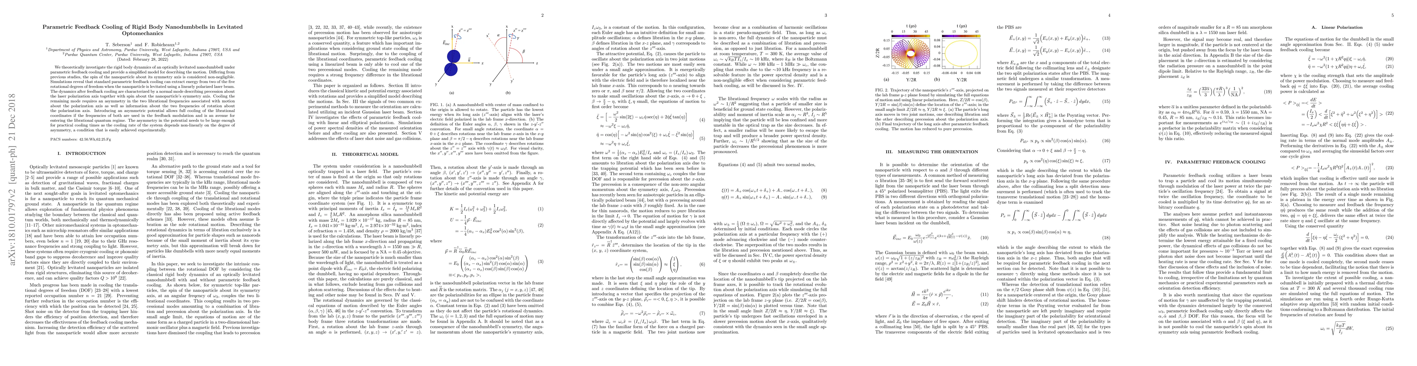 We theoretically investigate the rigid body dynamics of an optically levitated nanodumbbell under parametric feedback cooling and provide a simplified model for describing the motion. Differing from previous studies, the spin of the nanoparticle about its symmetry axis is considered non-negligible. Simulations reveal that standard parametric feedback cooling can extract energy from two of the five rotational degrees of freedom when the nanoparticle is levitated using a linearly polarized laser beam. The dynamics after feedback cooling are characterized by a normal mode describing precession about the laser polarization axis together with spin about the nanoparticle's symmetry axis. Cooling the remaining mode requires an asymmetry in the two librational frequencies associated with motion about the polarization axis as well as information about the two frequencies of rotation about the polarization axis. Introducing an asymmetric potential allows full cooling of the librational coordinates if the frequencies of both are used in the feedback modulation and is an avenue for entering the librational quantum regime. The asymmetry in the potential needs to be large enough for practical cooling times as the cooling rate of the system depends non-linearly on the degree of asymmetry, a condition that is easily achieved experimentally.