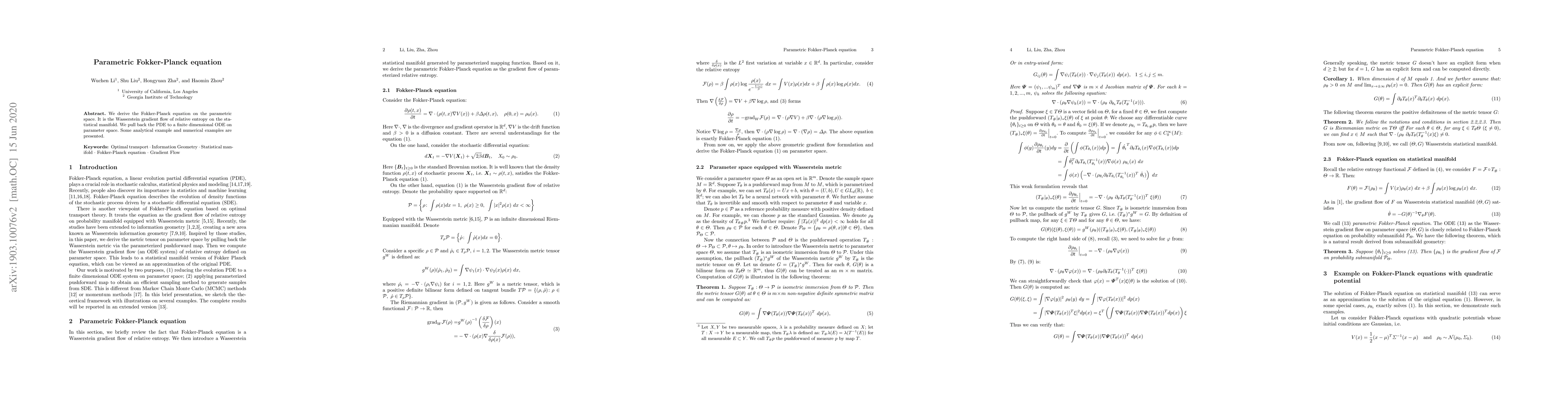 This paper derives the Fokker-Planck equation in parametric space, showing it as the gradient flow of relative entropy on a statistical manifold. It then translates the PDE into a finite-dimensional ODE on parameter space, providing analytical and numerical examples to illustrate the method.